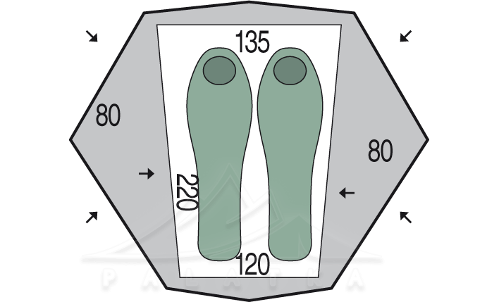 - Додаткова напівдуга збільшує корисний об'єм внутрішнього намету та тамбурів.
