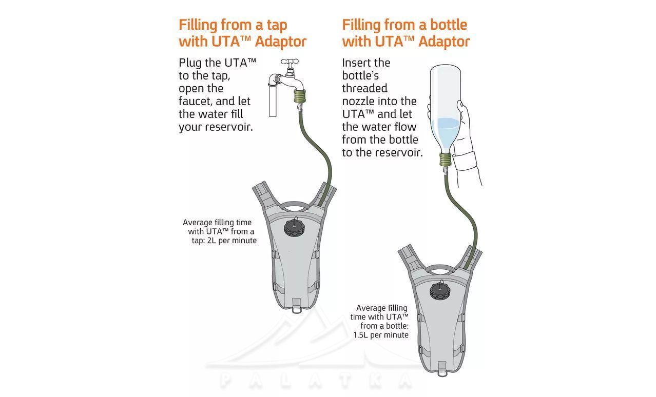 - Дуже просте використання: під'єднайте аксесуар до трубки гідратора з одного боку, а з іншого до пляшки з водою чи крана.