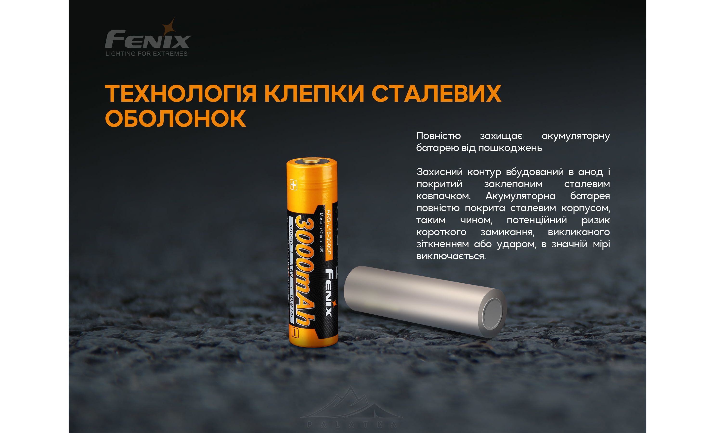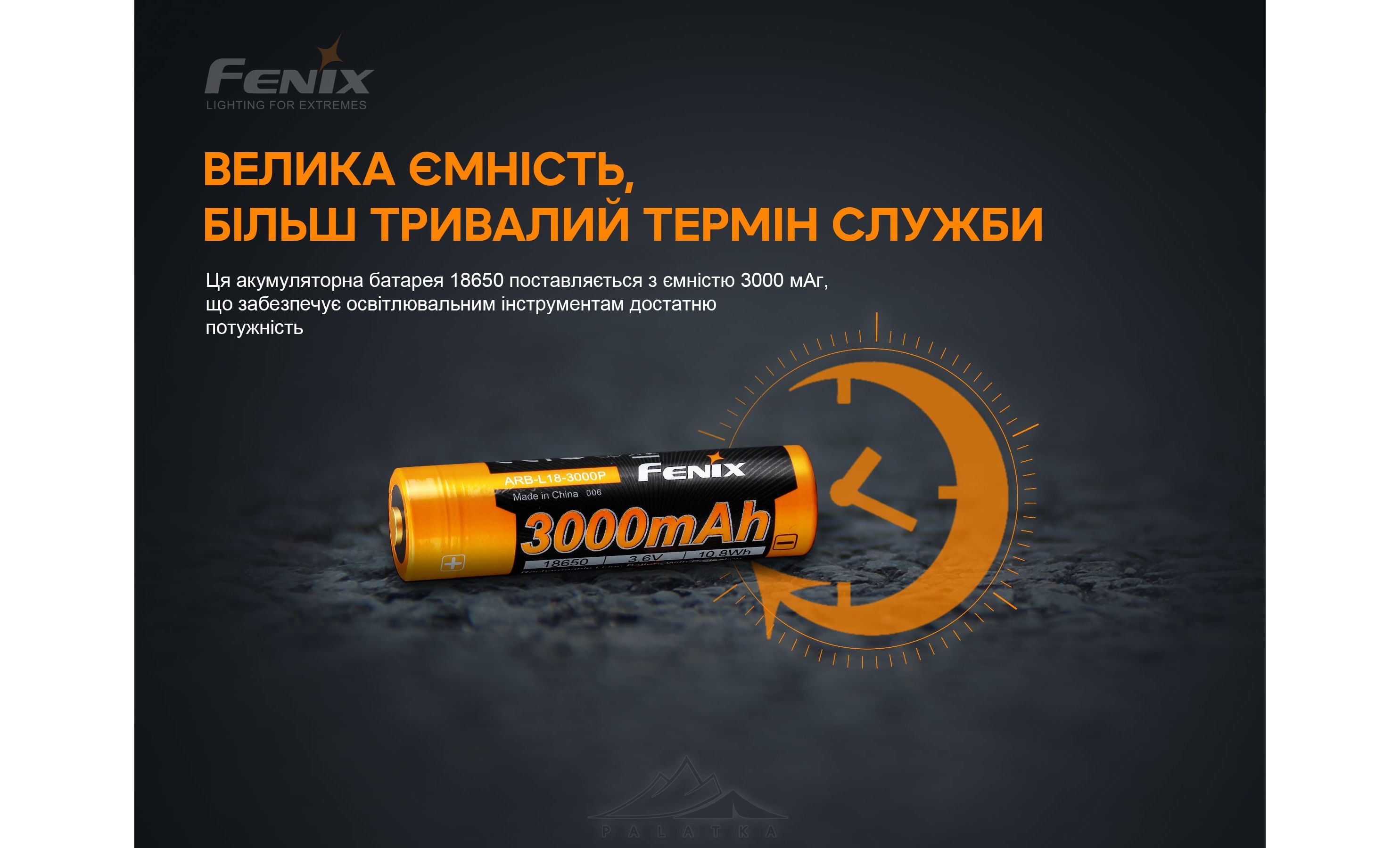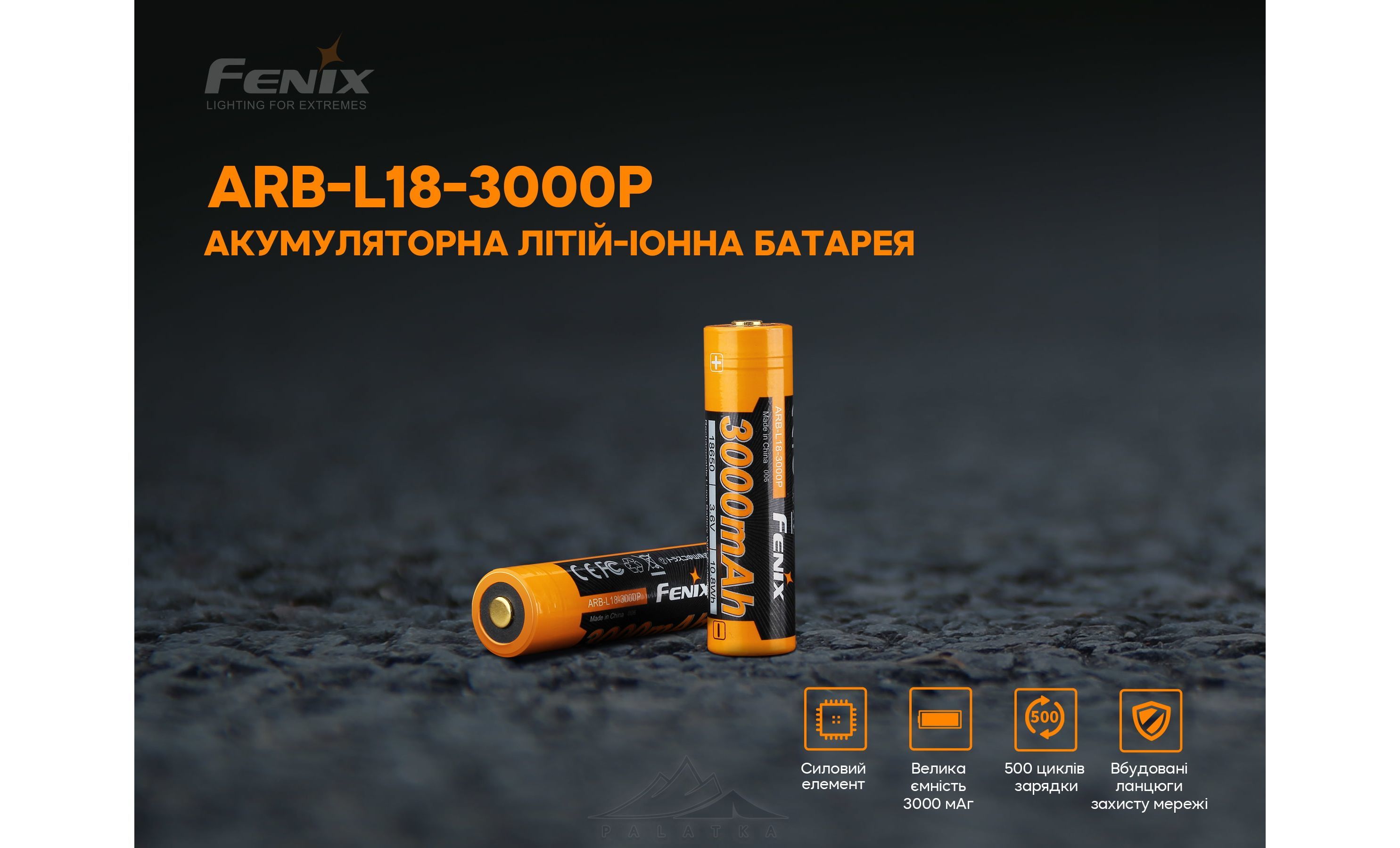 Fenix 18650 ARB-L18-3000P — літій-іонна акумуляторна батарея поширеного типу 18650 з високою ємністю та низьким саморозрядом. Cумісна із усіма ліхтарями Fenix, що підтримують формат 18650.