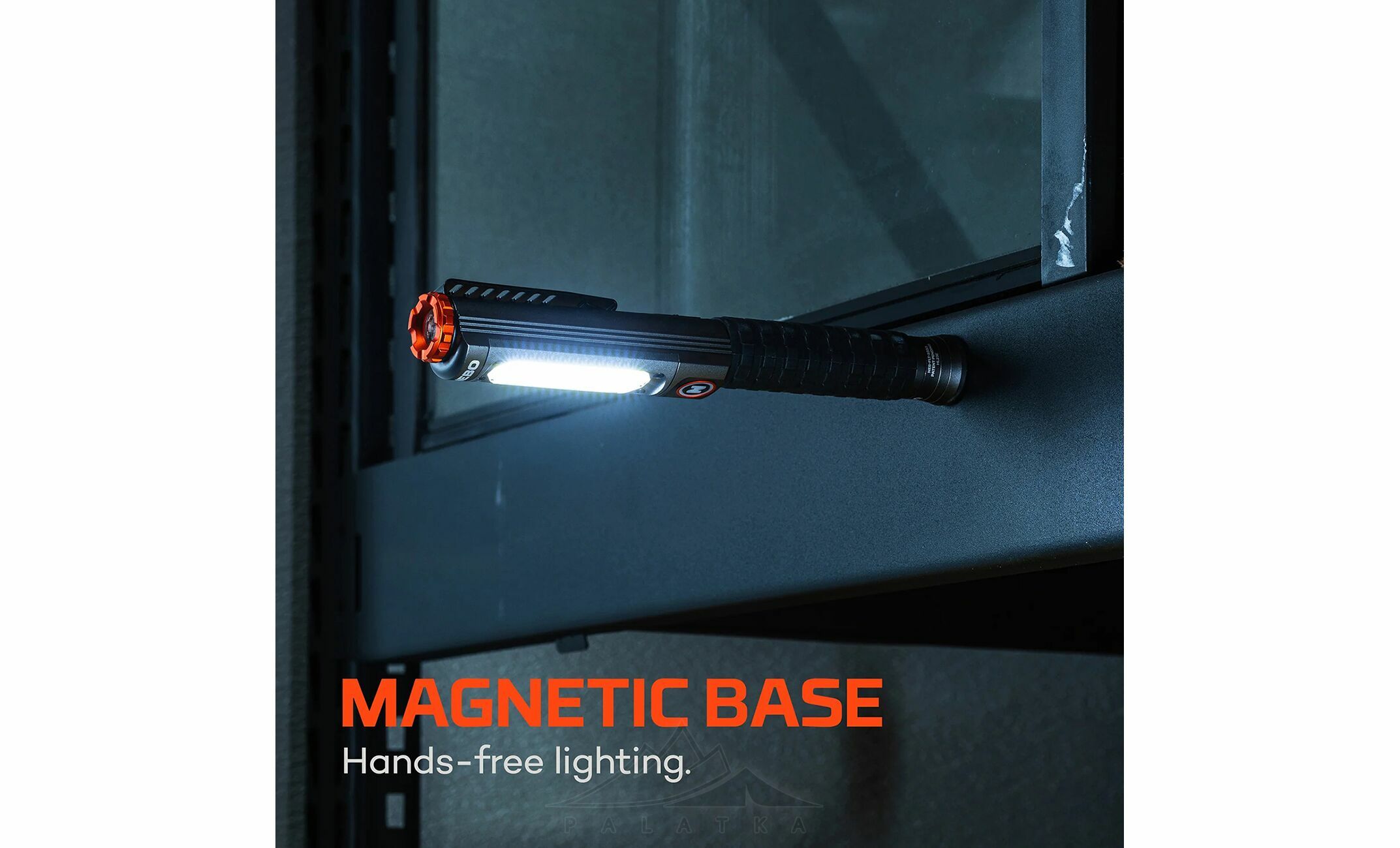- Магнітна основа — можна зафіксувати ліхтар на металевій поверхні для роботи вільними руками.