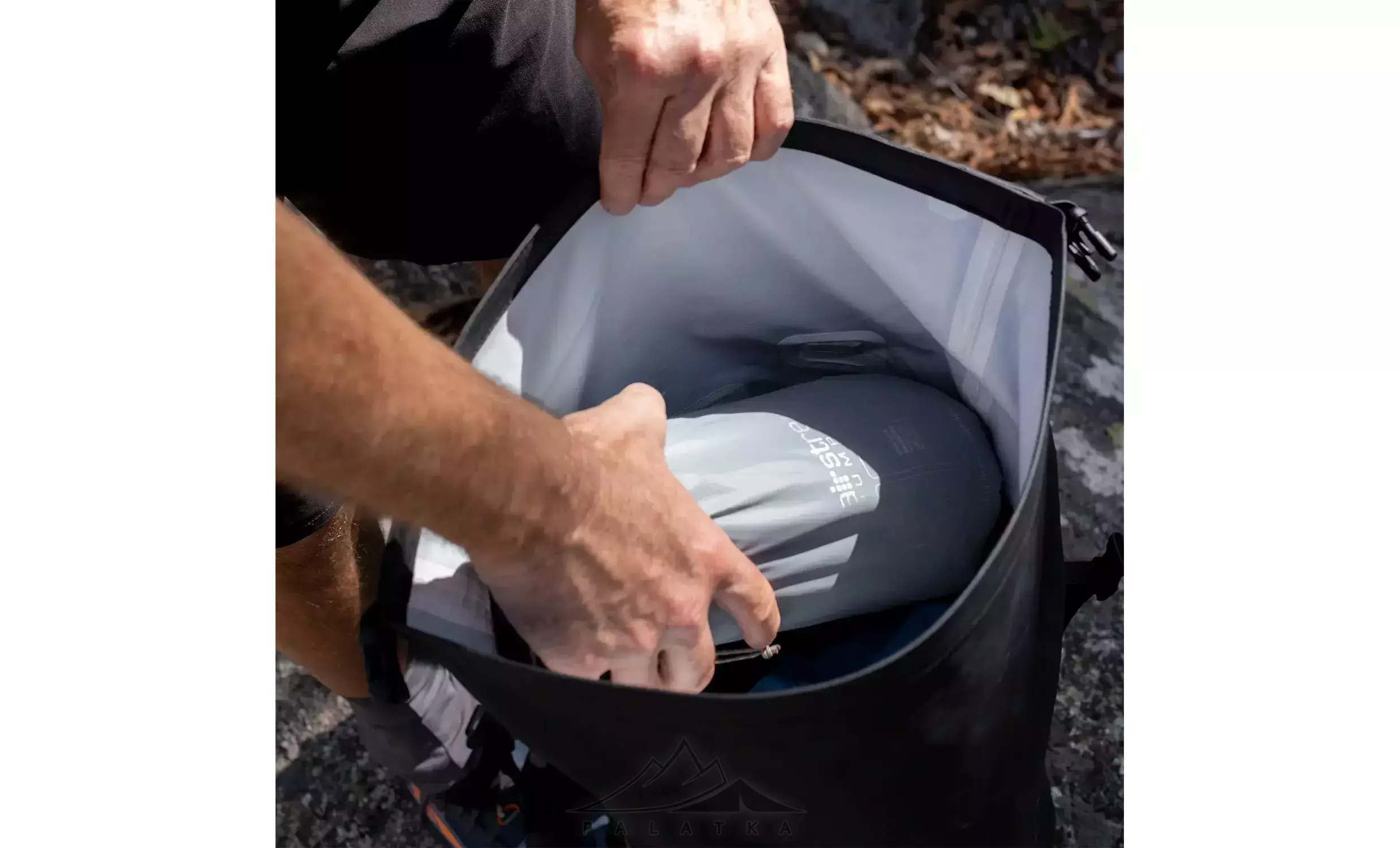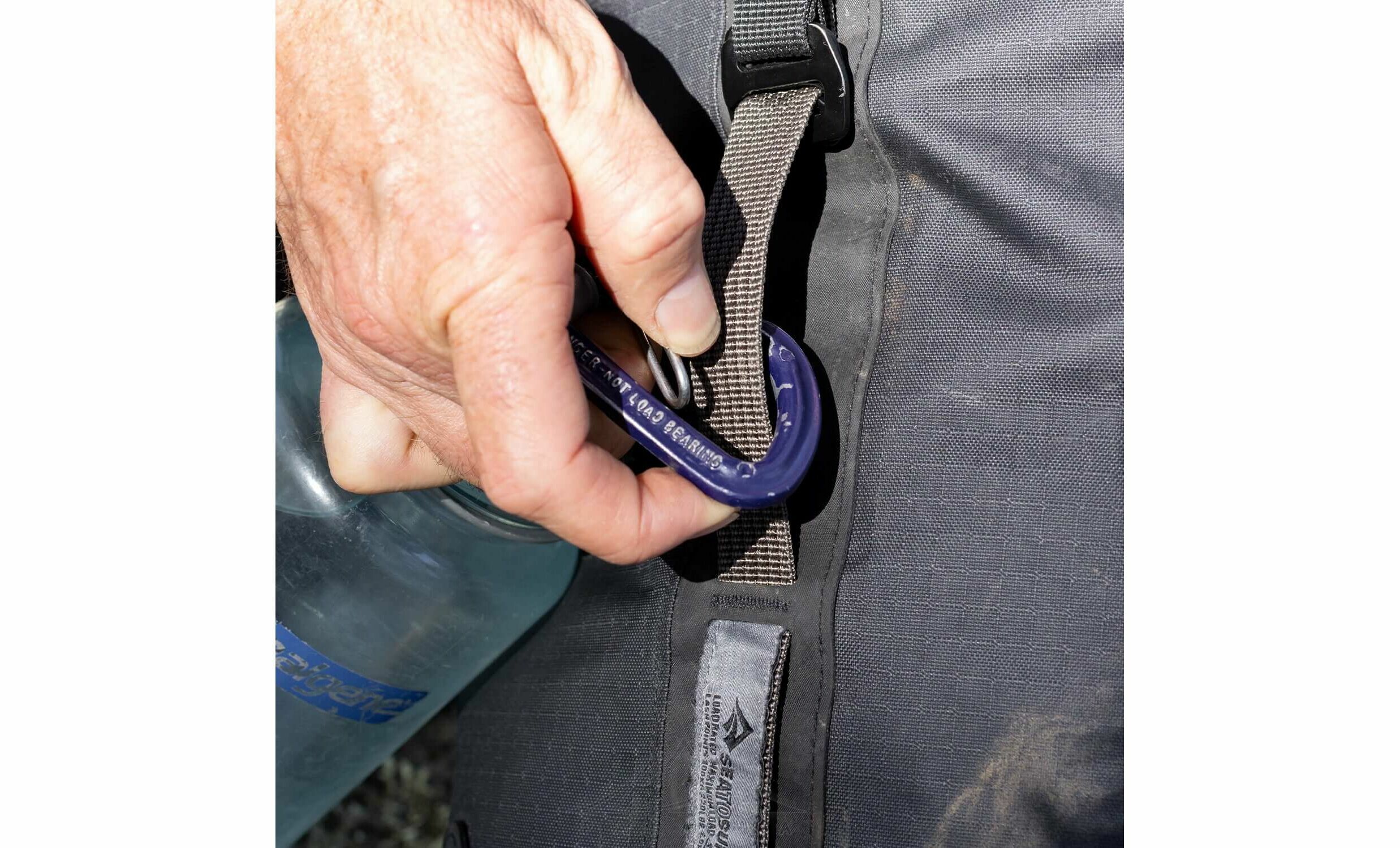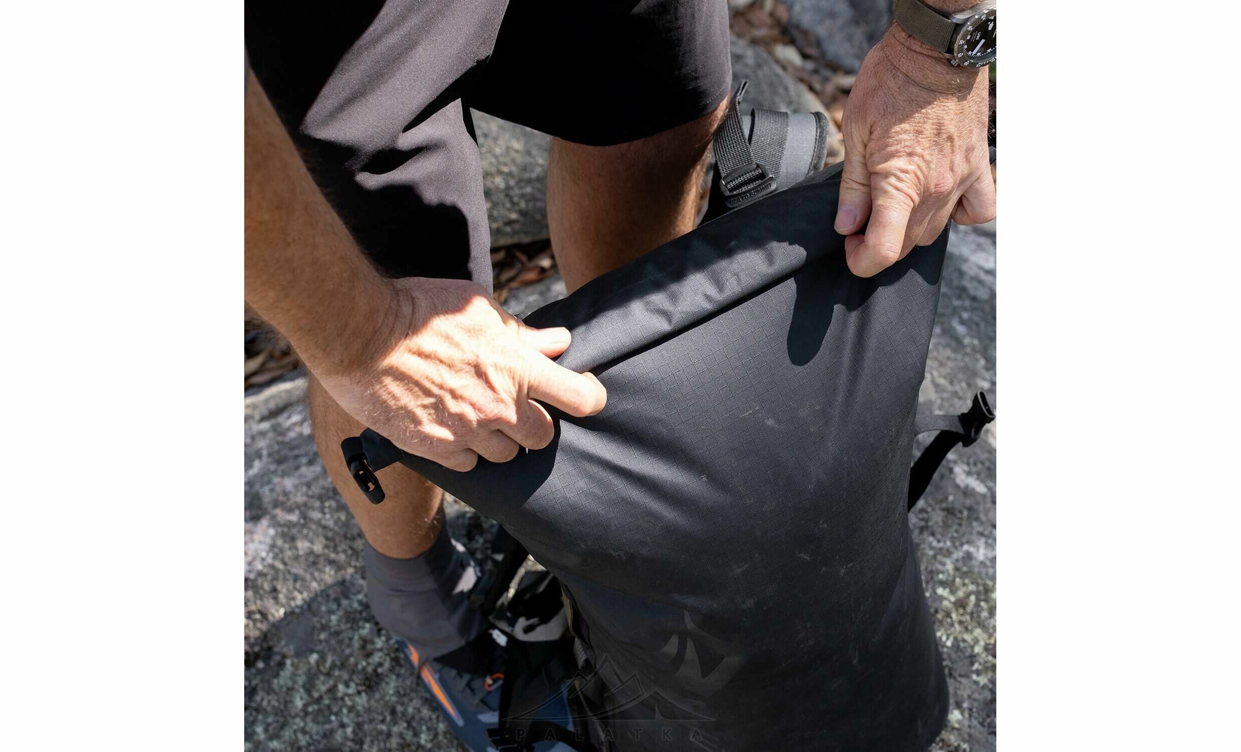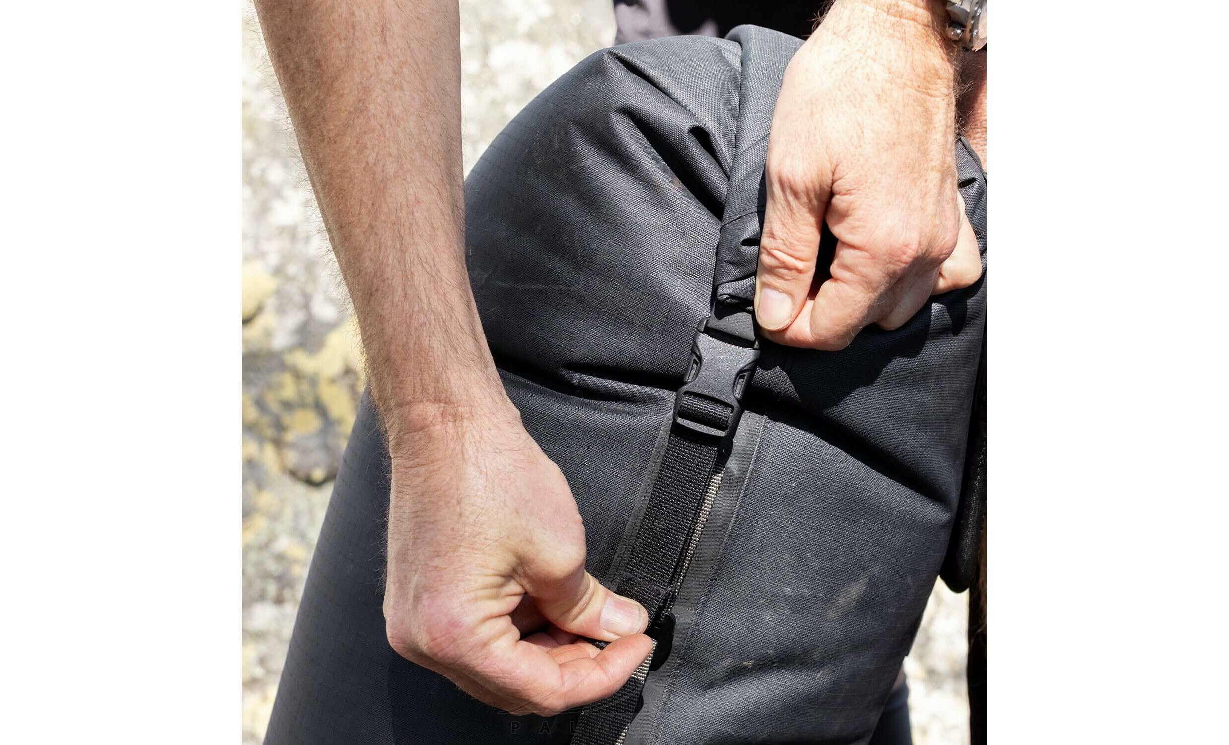 - Надійна застібка: система Hypalon Roll Top — закручування верхньої частини з фіксацією на фастекс та додатковою пряжкою для щільного ущільнення.