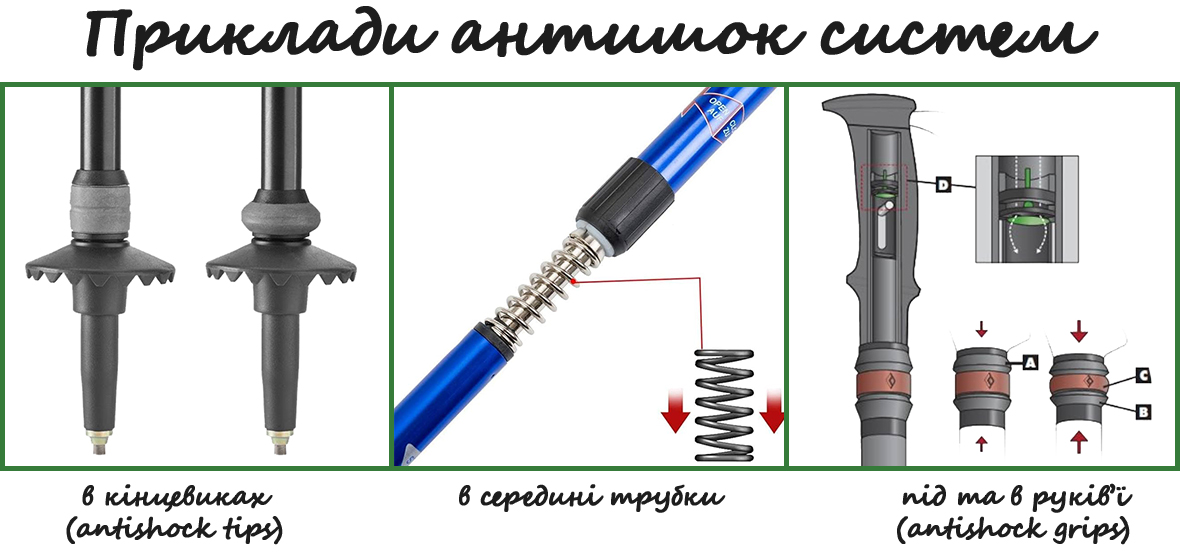 Антишок — це спеціальний механізм у палицях, який поглинає удари та вібрації під час їх використання. Основна мета — зменшити навантаження на руки, лікті та плечі туриста, особливо на нерівних поверхнях або під час спуску, де удари від контакту палиць із землею можуть передаватися на тіло.