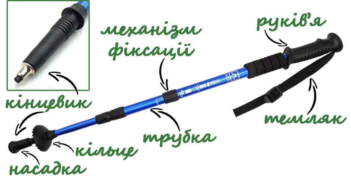 - Механізми фіксації: Це внутрішні або зовнішні затискачі, які забезпечують надійну фіксацію секцій у складних палицях. Зовнішні затискачі відносно легко замінити, а от внутрішні фіксатори потребують більше зусиль.