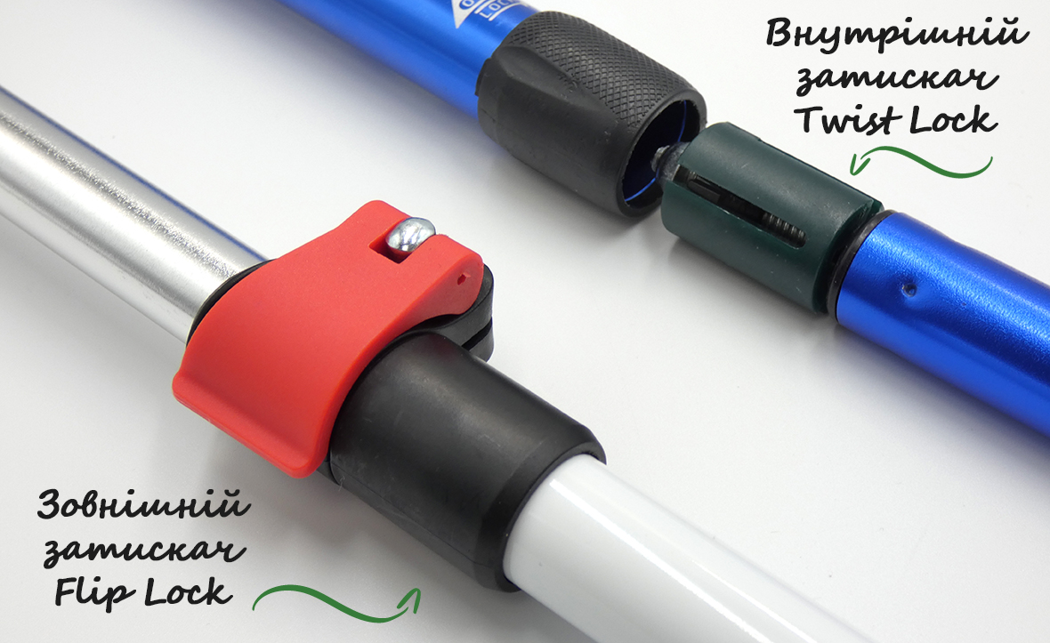 - Зовнішні фіксатори (Flip Lock): Це найбільш поширений і надійний варіант. Кожна секція фіксується за допомогою зовнішнього затискача, який легко відкривається і закривається вручну. Вони забезпечують швидке регулювання довжини навіть в умовах холодної погоди або в рукавичках.