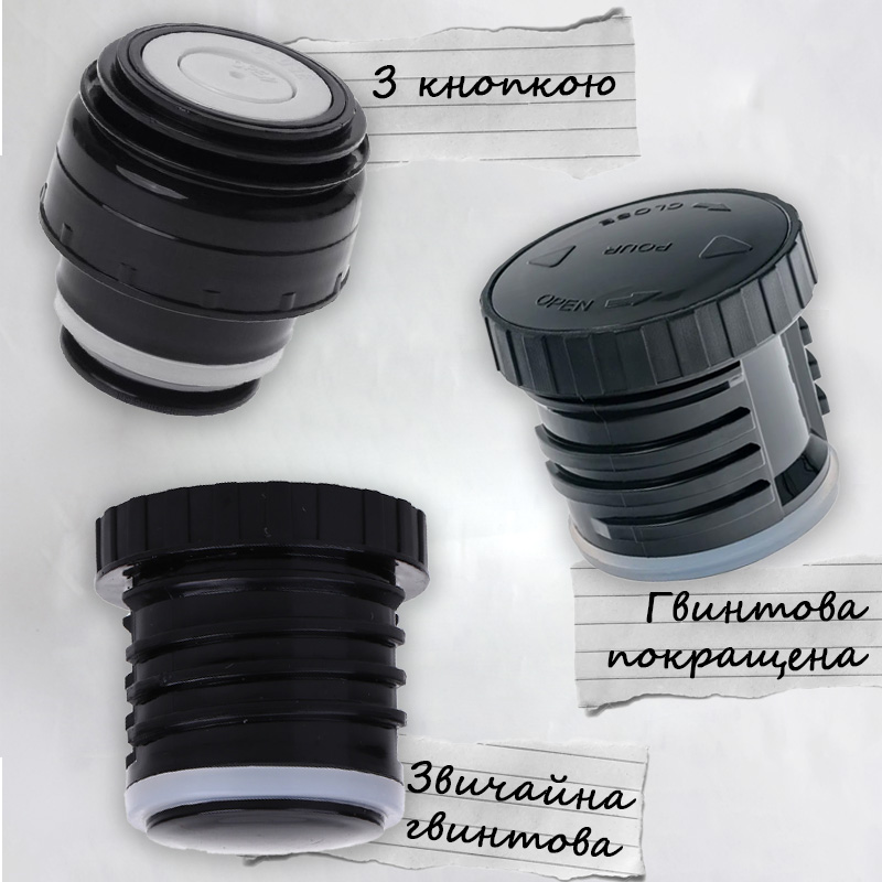 Пробка з кнопкою. Вона дуже проста у використанні та чудово підійде для дітей. Але кнопку зламати дещо простіше, ніж гвинтову пробку. Отже, наявність кнопки дещо зменшує строки гарантії термоса.