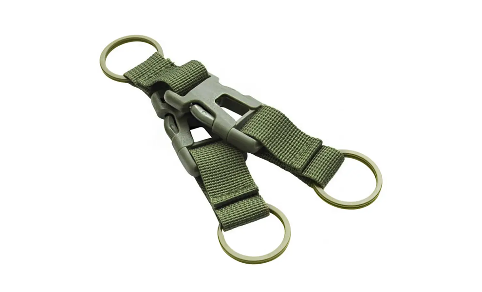 - Складається з: двох пластикових пряжек на фастексі, зі стропою та кільцями для ключів.