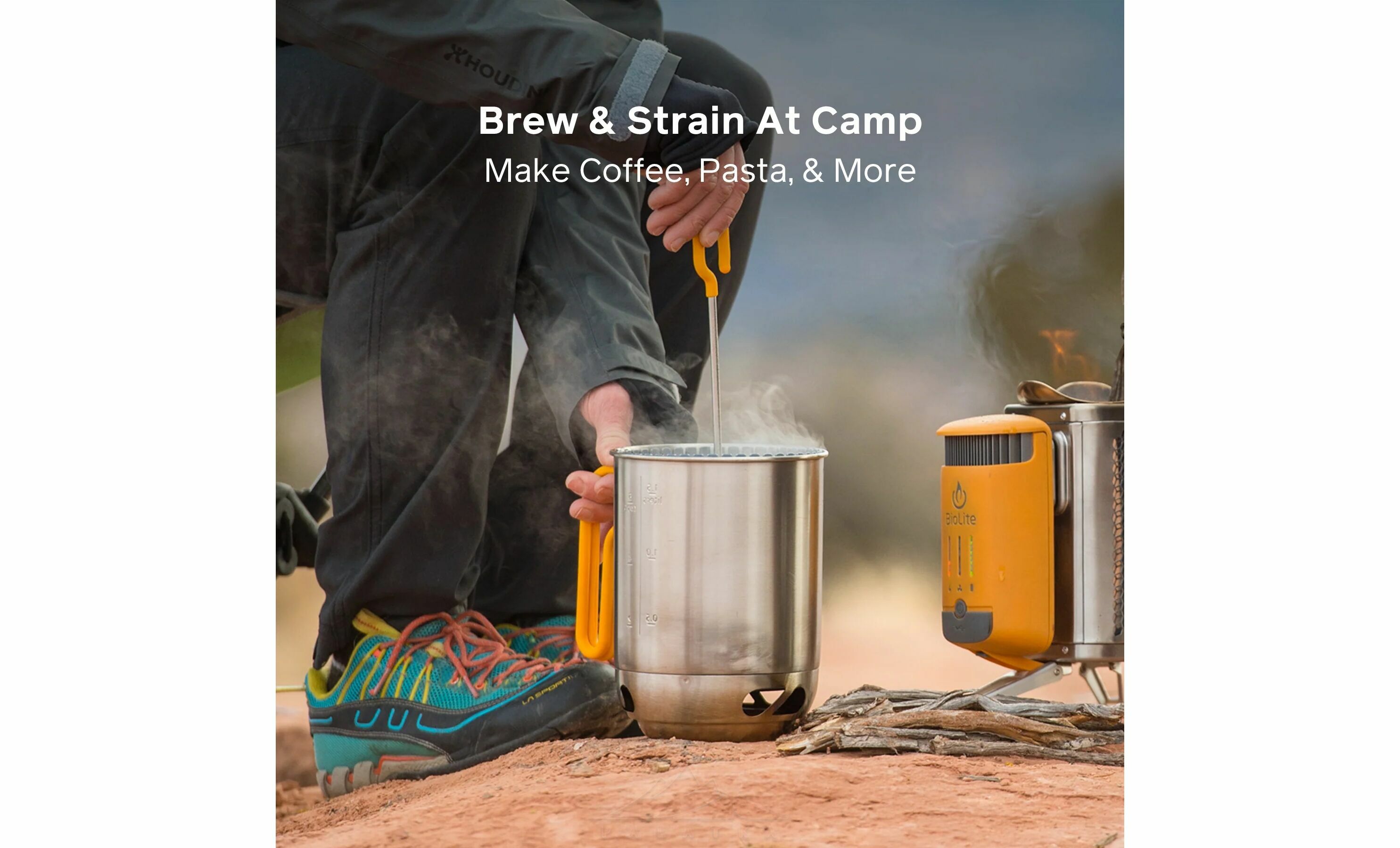 BioLite Campstove KettlePot & Coffee Set - набір з чайника та преса для кави для портативної дров'яної пічки-зарядки BioLite CampStove. З цими аксесуарами ви зможете не тільки кип'ятити воду і робити каву, а ще й готувати їжу на пару.