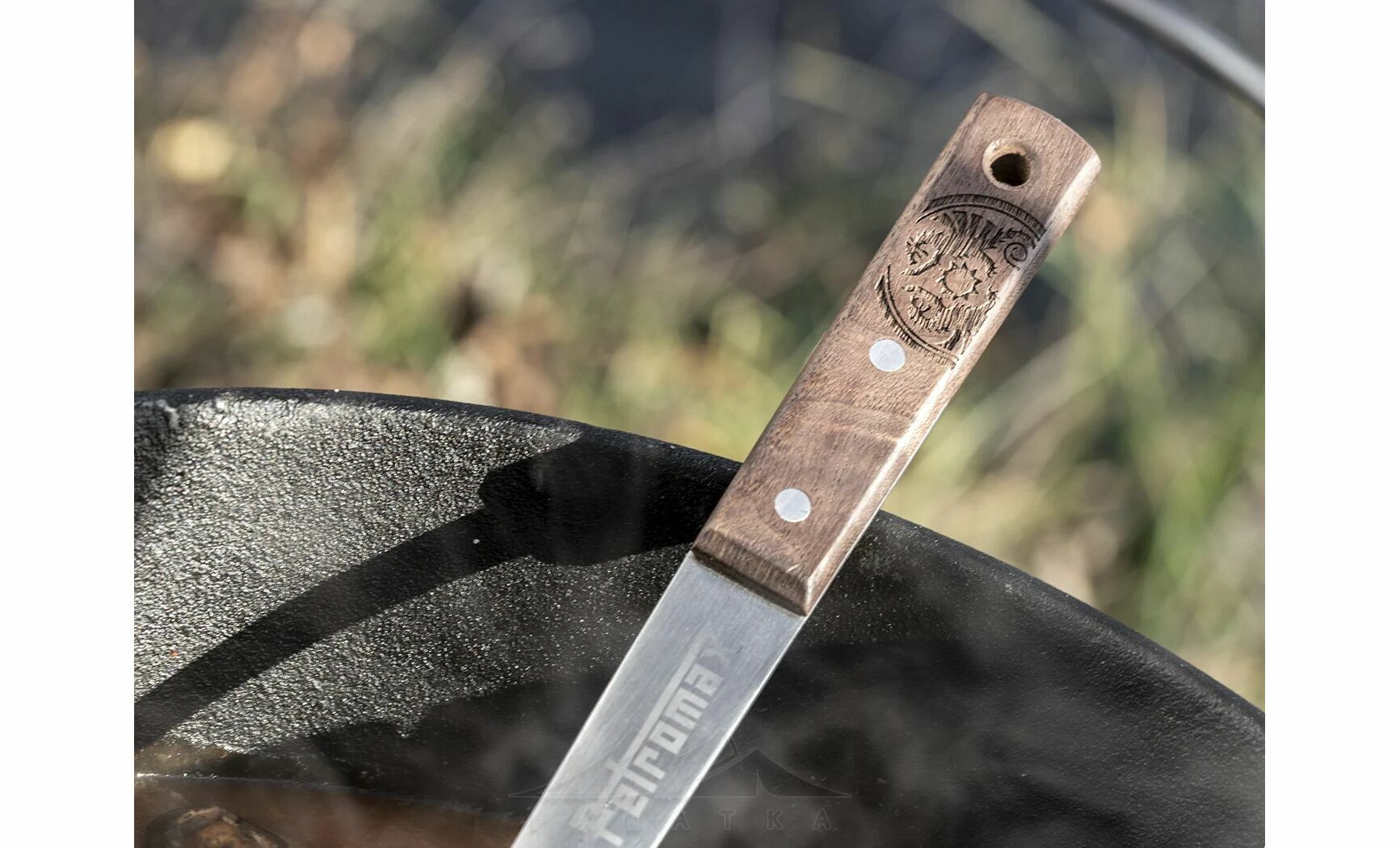 - Виготовлений з високоякісних матеріалів — нержавіючої сталі, руків'я — з горіхового дерева, що забезпечує високу міцність, зносостійкість, стійкість до вигину та корозії.