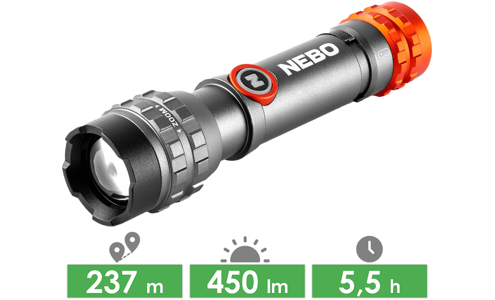 - Максимальна яскравість 450 люмен — достатньо для впевненої підсвітки маршруту, робочої зони або огляду навколо.