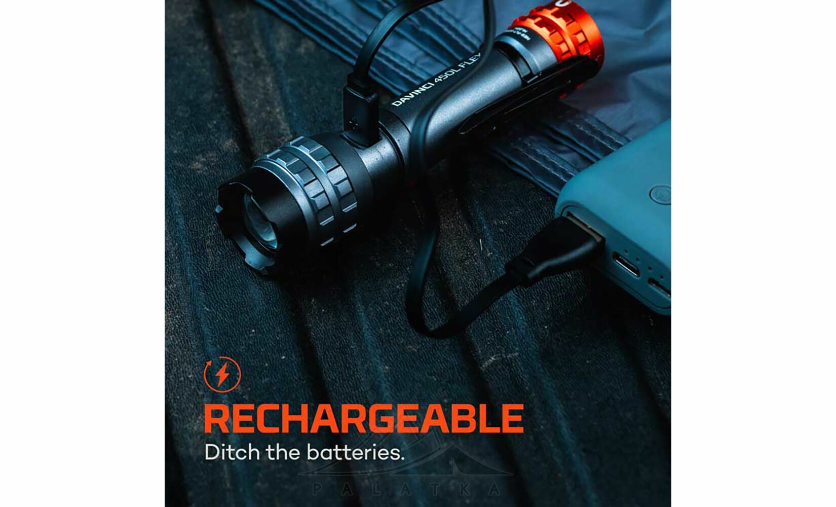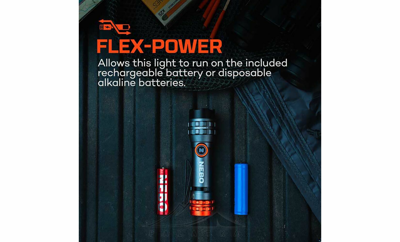 - Flex-Power / гібридне живлення — ліхтар працює від 1x14500 акумулятора (у комплекті) або 1xAA батарейки, що зручно як запасний варіант у дорозі.