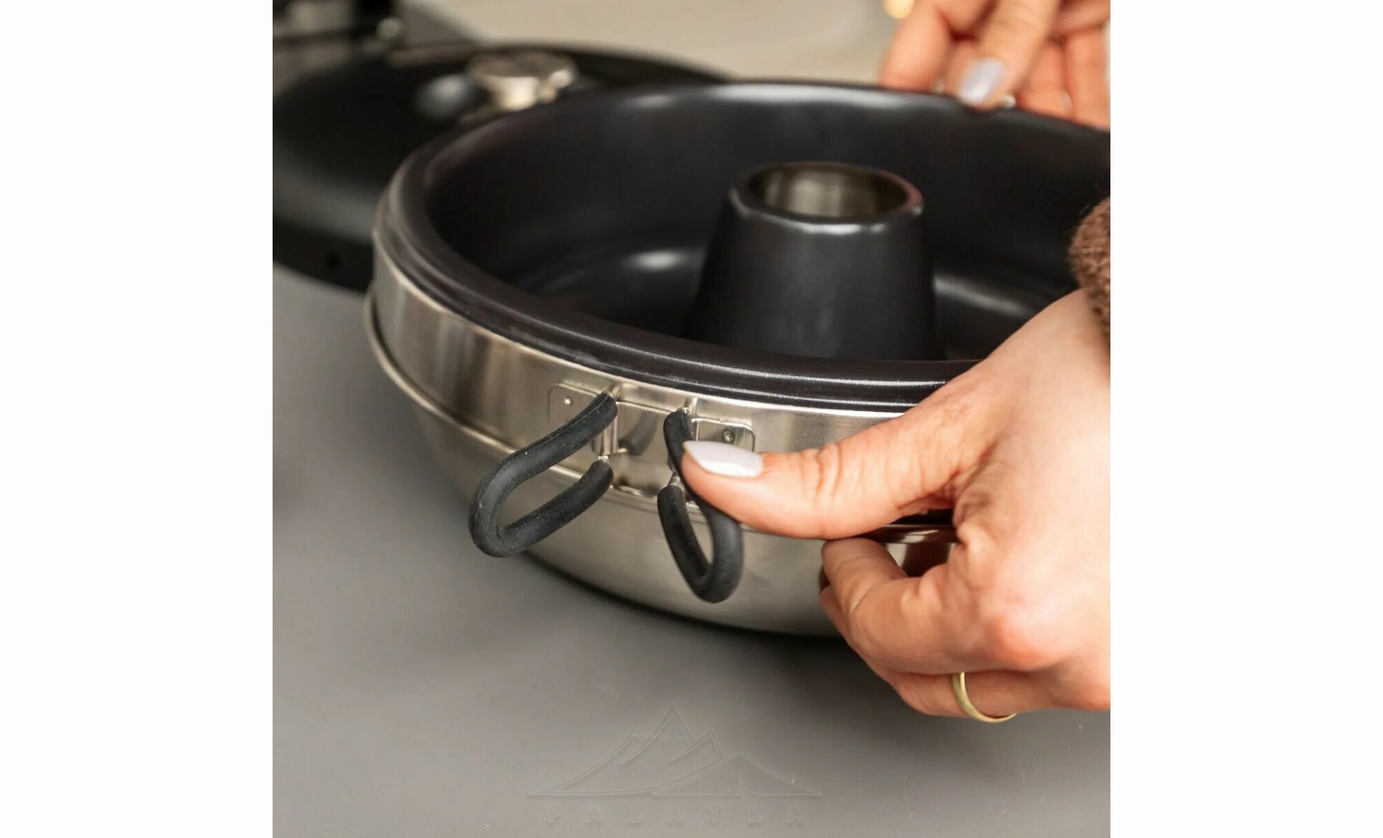 - Подвійні бічні петлеподібні ручки з силіконовими накладками для захисту від опіків, зручного перенесення і подачі страв.