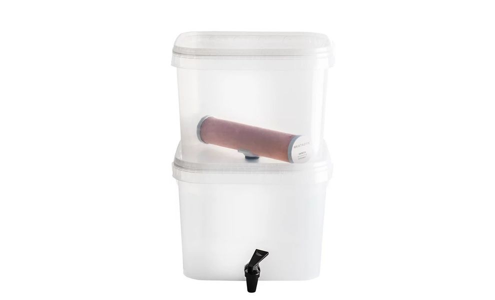 - Фільтр гравітаційного типу: верхній резервуар наповнюється брудною водою, потім встановлюється поверх нижнього резервуара та під дією сили тяжіння вода проходить через елемент, що фільтрує, і зливається в нижню ємність. Не вимагає участі людини для прокачування води як у фільтрах насосного типу.