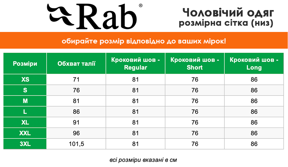 Таблиця розмірів чоловічого нижнього одягу Rab