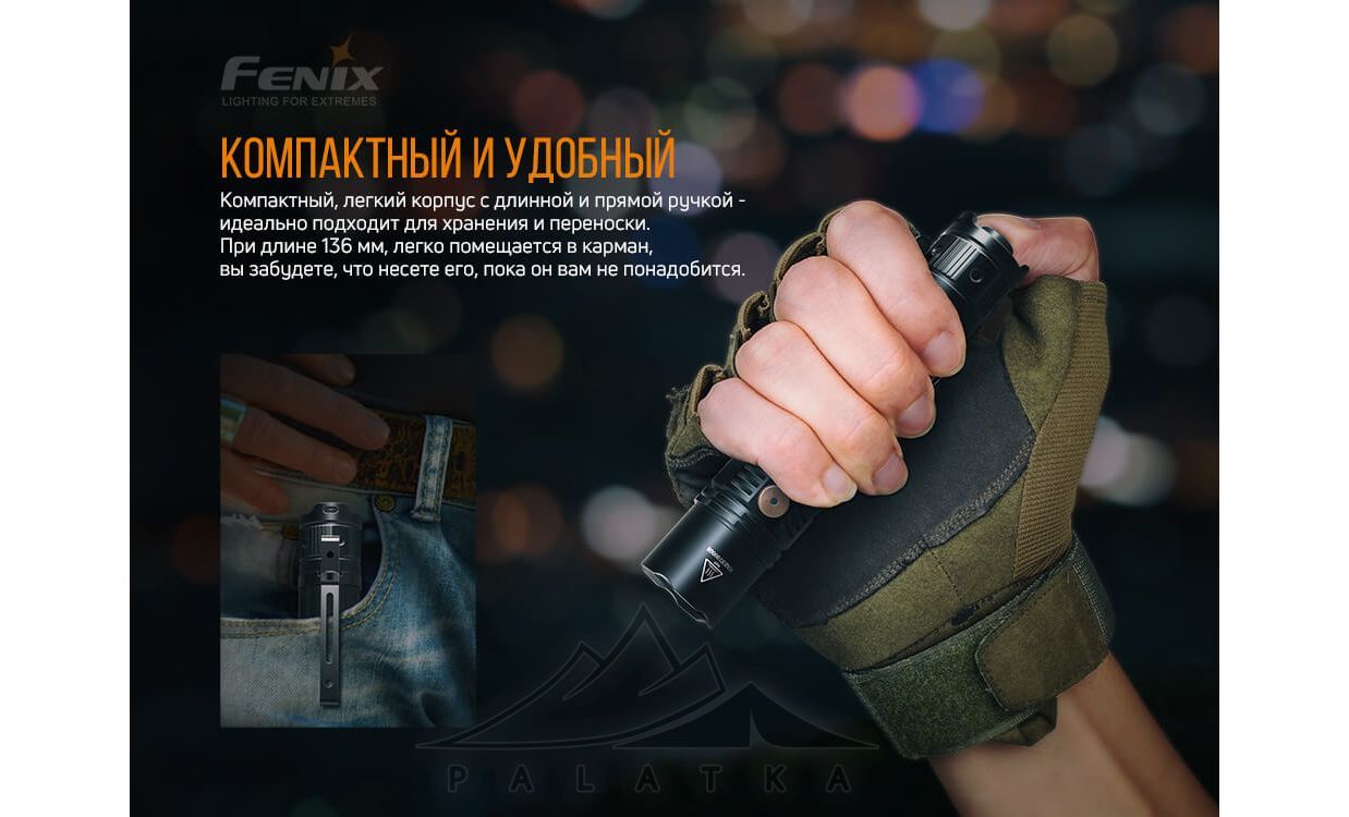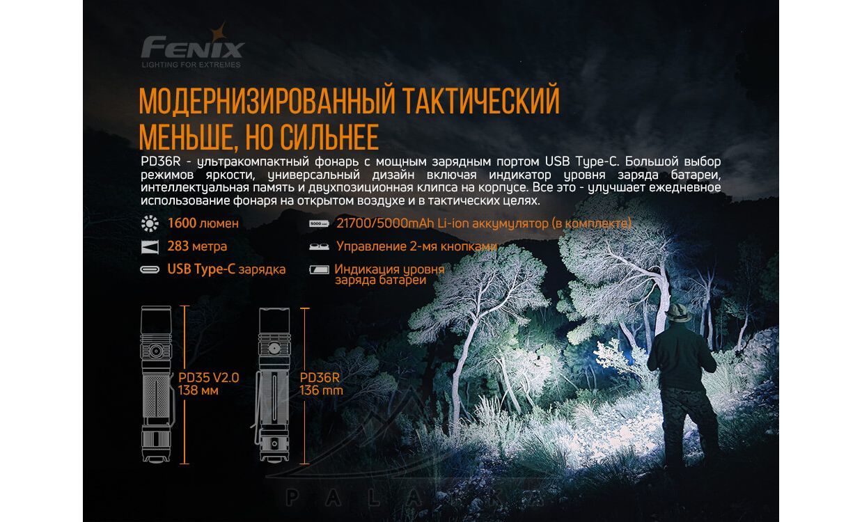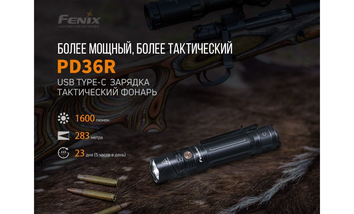 Ліхтар ручний Fenix PD36R — ультракомпактний та потужний тактичний ліхтар, що перезаряджається. Завдяки компактному розміру може використовуватись як кишеньковий ліхтар.