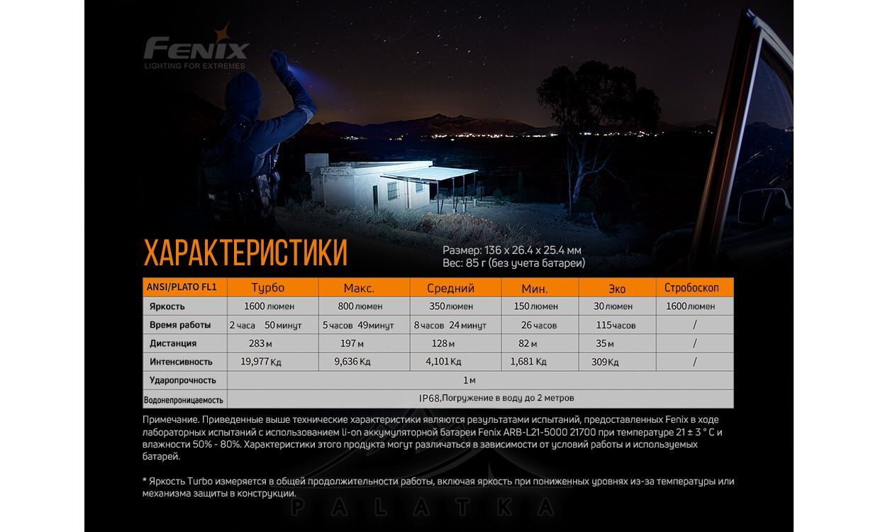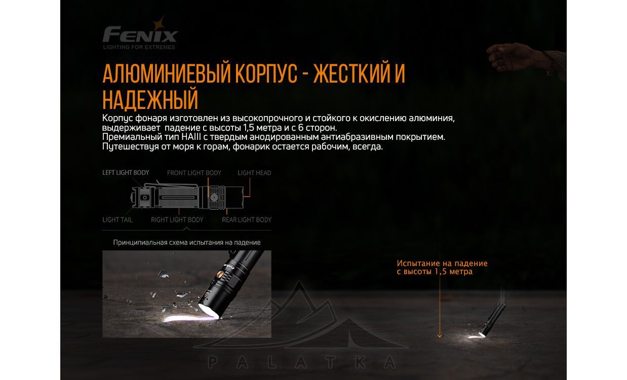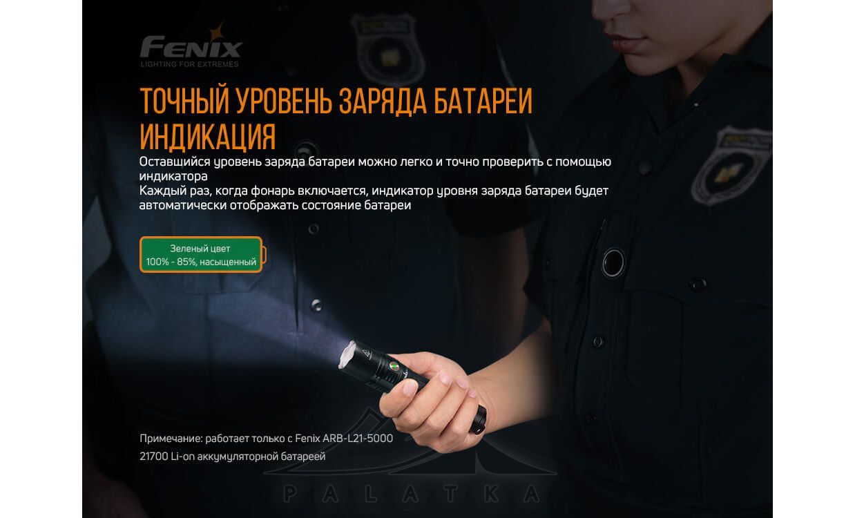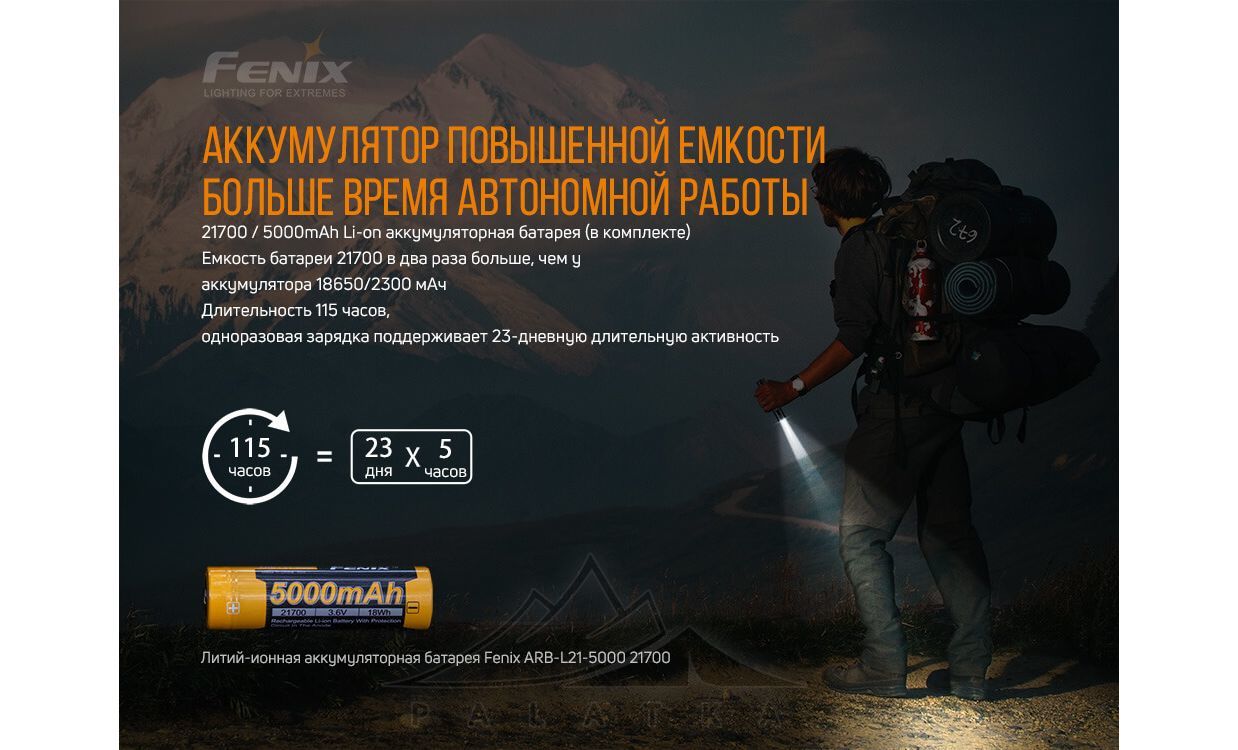 - Живлення від однієї батареї типу 21700 (акумулятор Fenix ARB-L21-5000 входить у комплект).