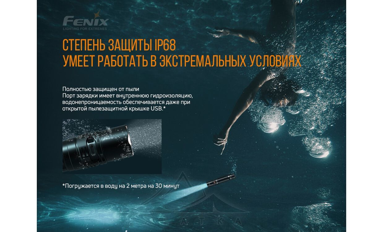 - Ступінь захисту IP68 забезпечує захист від пилу, бруду та піску та водонепроникність – ліхтар може працювати на глибині 2 м під водою протягом 30 хвилин.