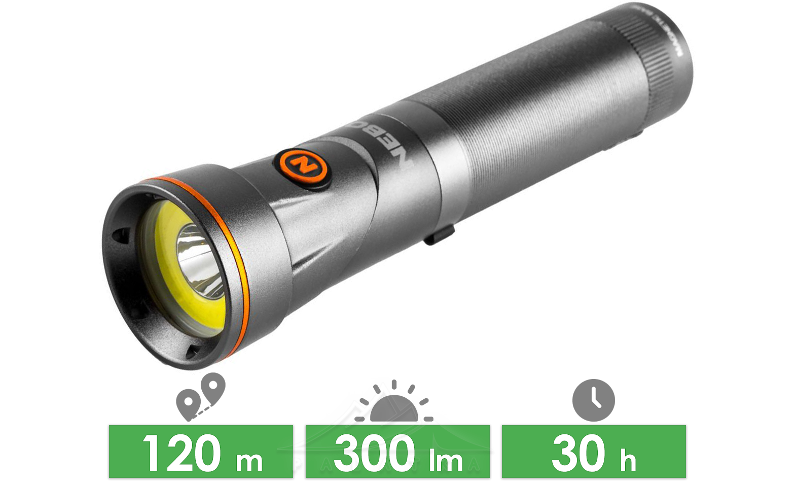 - Оснащений світлодіодом COB LED з максимальною потужністю яскравості 300 люмен і дальністю променя 120 метрів.