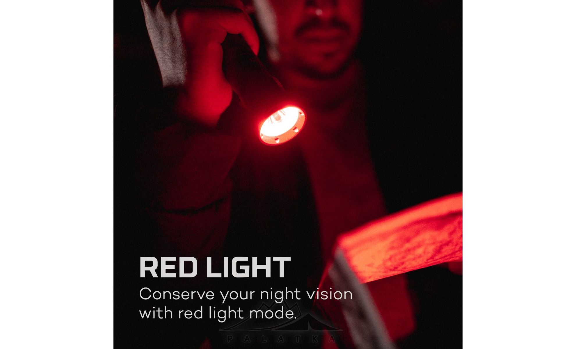 - Працює у 7 режимах освітлення: 2 режими білого світла, 2 режими білого ближнього світла, 2 режими червоного ближнього світла та червоний строб.