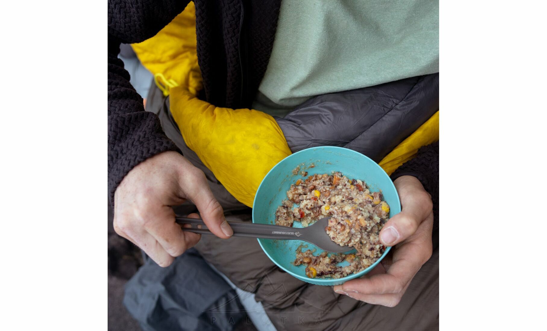 - Подовжена ручка підходить для використання у глибоких ємностях, щоб дістати до дна пакетів туристичної їжі.