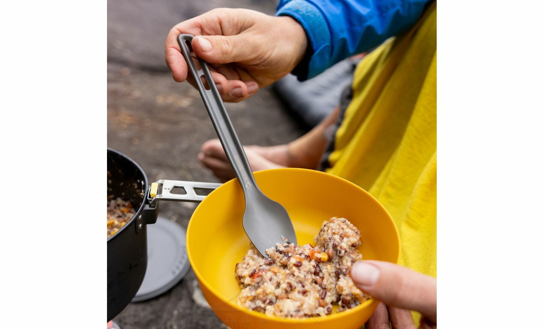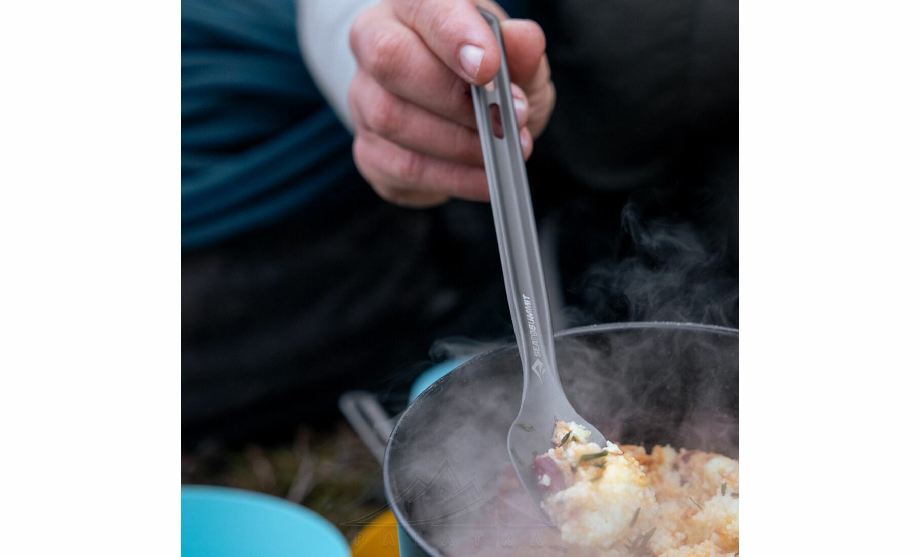 - Подовжена ручка підходить для використання у глибоких ємностях, щоб дістати до дна пакетів туристичної їжі.