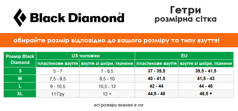 Black Diamond Apex — повнорозмірні мембранні гетри, призначені для використання з трекінговими черевиками. Стануть в нагоді для будь-яких активностей в холодну та вологу погоду - зимовогу спорту, льодолазіння, чи альпінізму.