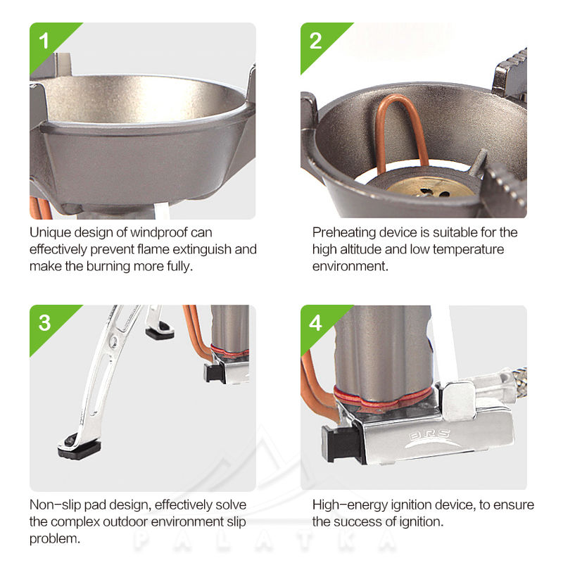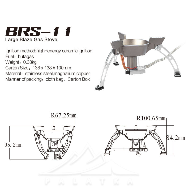 Газовий пальник BRS-11 — являє собою пальник з мідного сплаву високої міцності та нержавіючої сталі, стійкий до високих температур. Підходить для використання у туристичній діяльності, на пікніках, у подорожах, на рибалці, на дачі та в інших різних ситуаціях.