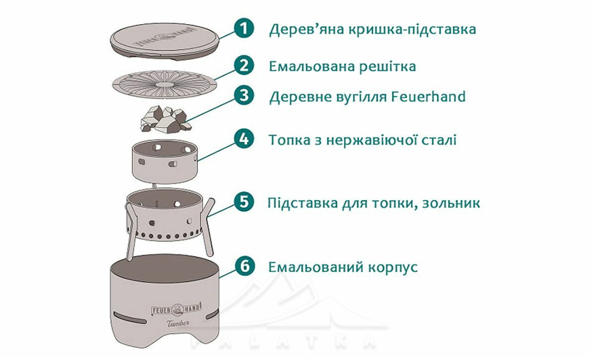 Feuerhand Tamber — стильний, компактний і багатофункціональний настільний гриль на вугіллі, розроблений для приготування ароматних закусок із копченням та хрусткою скоринкою, а також виконує роль конфорки — на ньому зручно варити каву, чай, соуси, глінтвейн або фондю. Ідеальне рішення для міні-барбекю на пікніку, терасі, та кемпінгового відпочинку.
