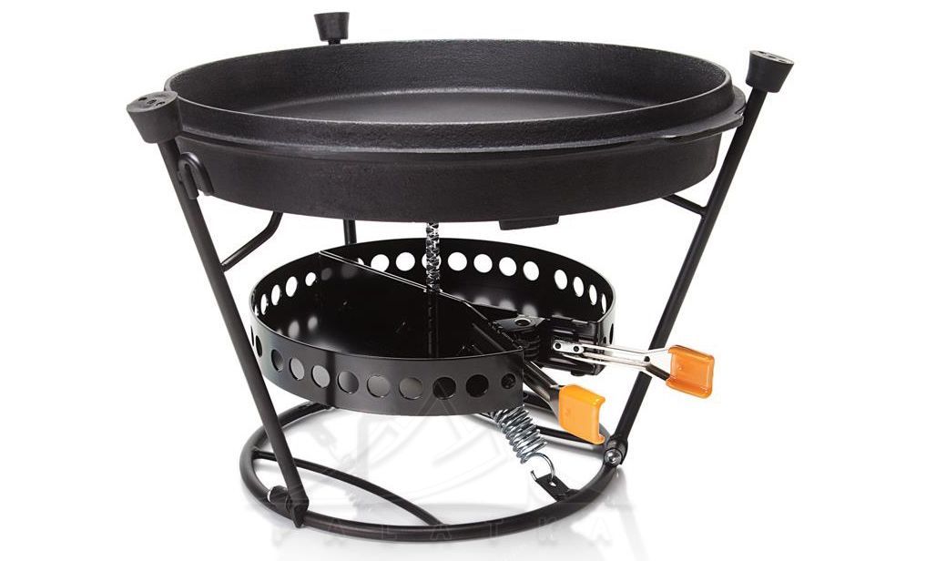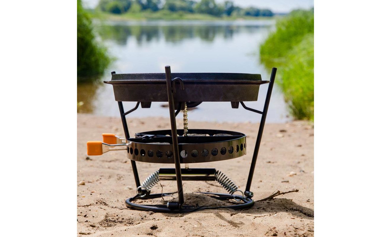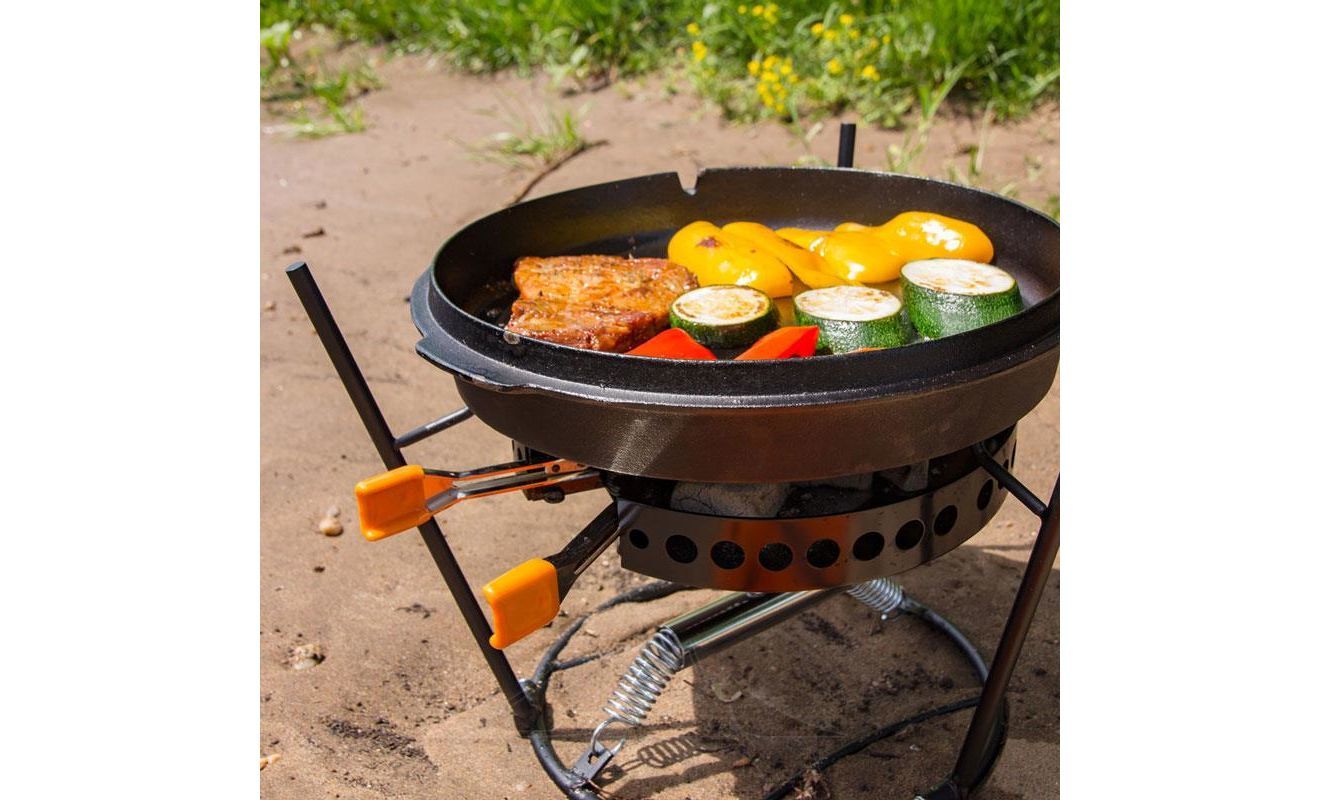 - Для приготування їжі на кришці казана Dutch Oven. Якщо зняти решітку-гриль, та встановити замість неї кришку казана Dutch Oven, портативний гриль може використовуватись як велика пласка поверхня для приготування їжі.