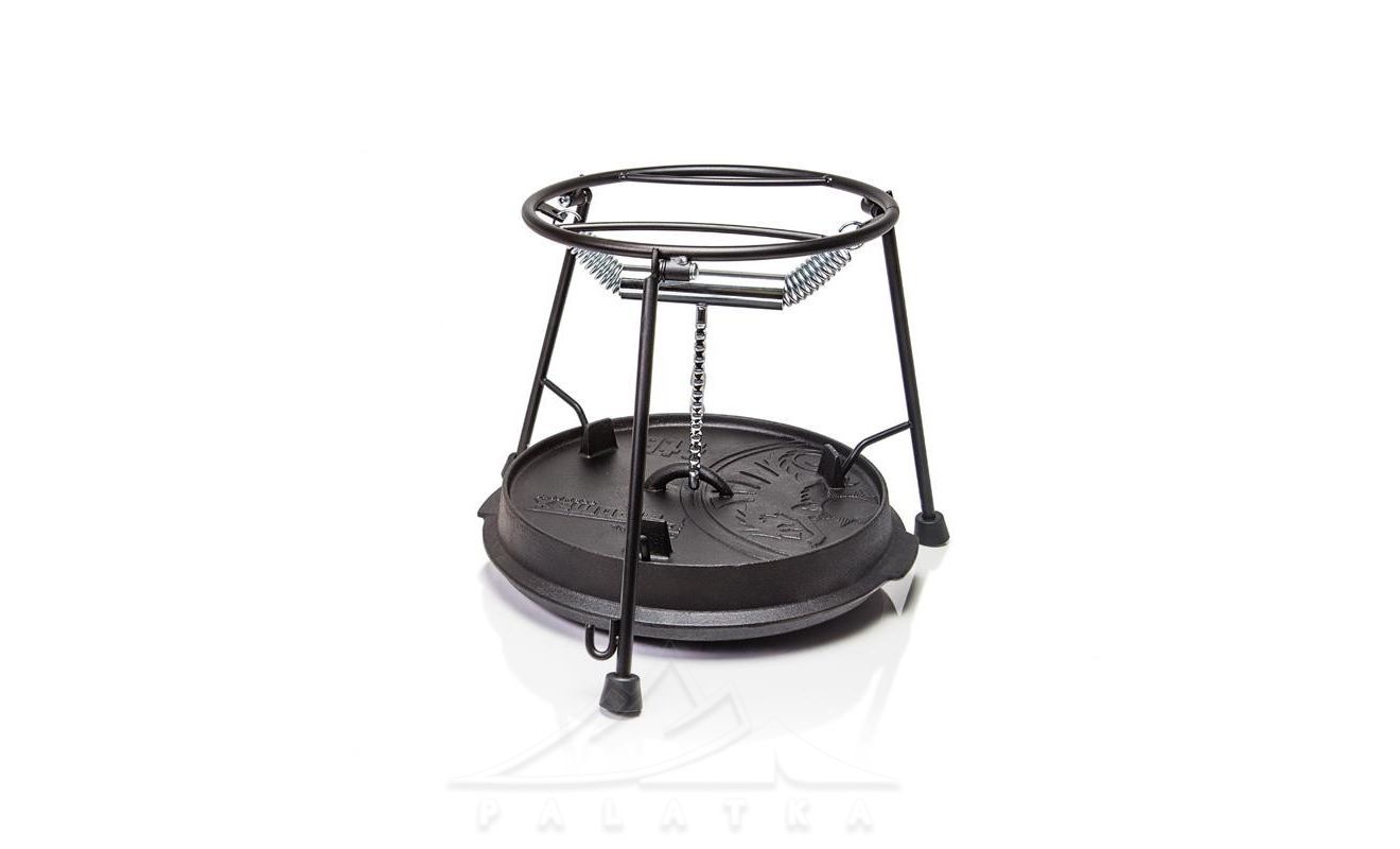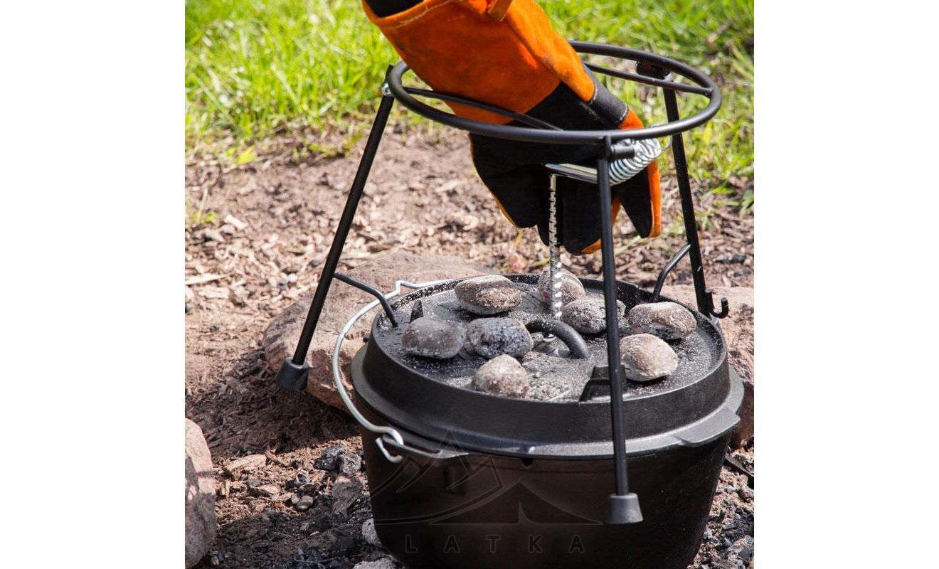 - Для гарячого копчення. Зберіть гриль, додайте у піддон Charcoal Tray Pro-Ft вугілля разом з тріскою для копчення. Потім поставте під нього на потрібну висоту піддон, потім встановіть його на необхідну висоту. Розмістіть на решітці-гриль підготовлене м'ясо або рибу та накрийте казаном Dutch Oven. Таким чином тріска буте тліти та виділяти дим, який буде концентруватися під казаном.