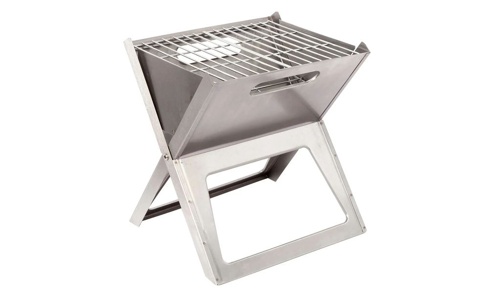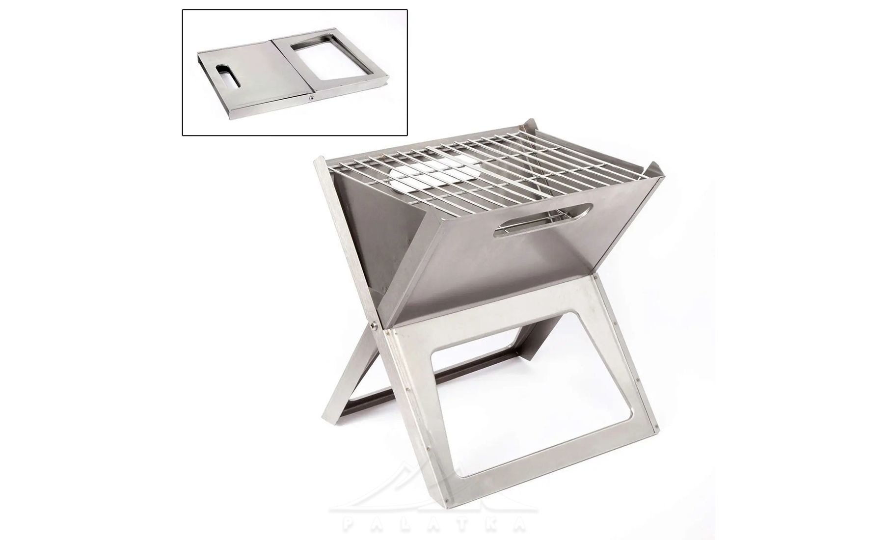 Гриль вугільний Bo-Camp Notebook/Fire Basket Compact — компактний плоский складний гриль з нержавіючої сталі, який можна використовувати для барбекю, а також для готування на дровах та розведення багаття.