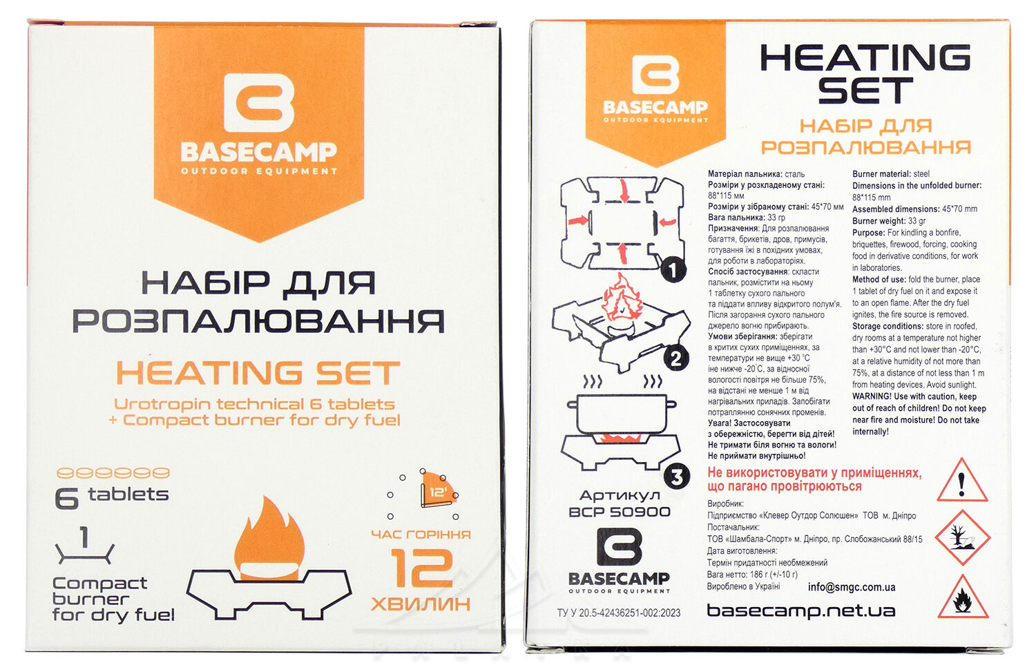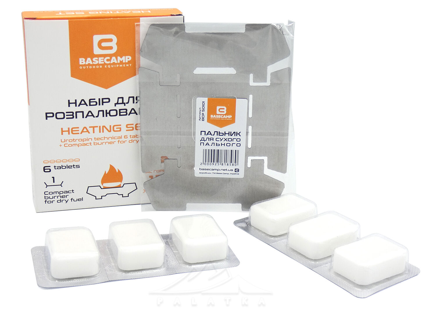 BaseCamp Heating Set — компактний набір для підігріву їжі чи кип'ятіння води в туристичному посуді за допомогою сухого пального. Також цей набір допоможе вам швидко та безпечно розпалити багаття.