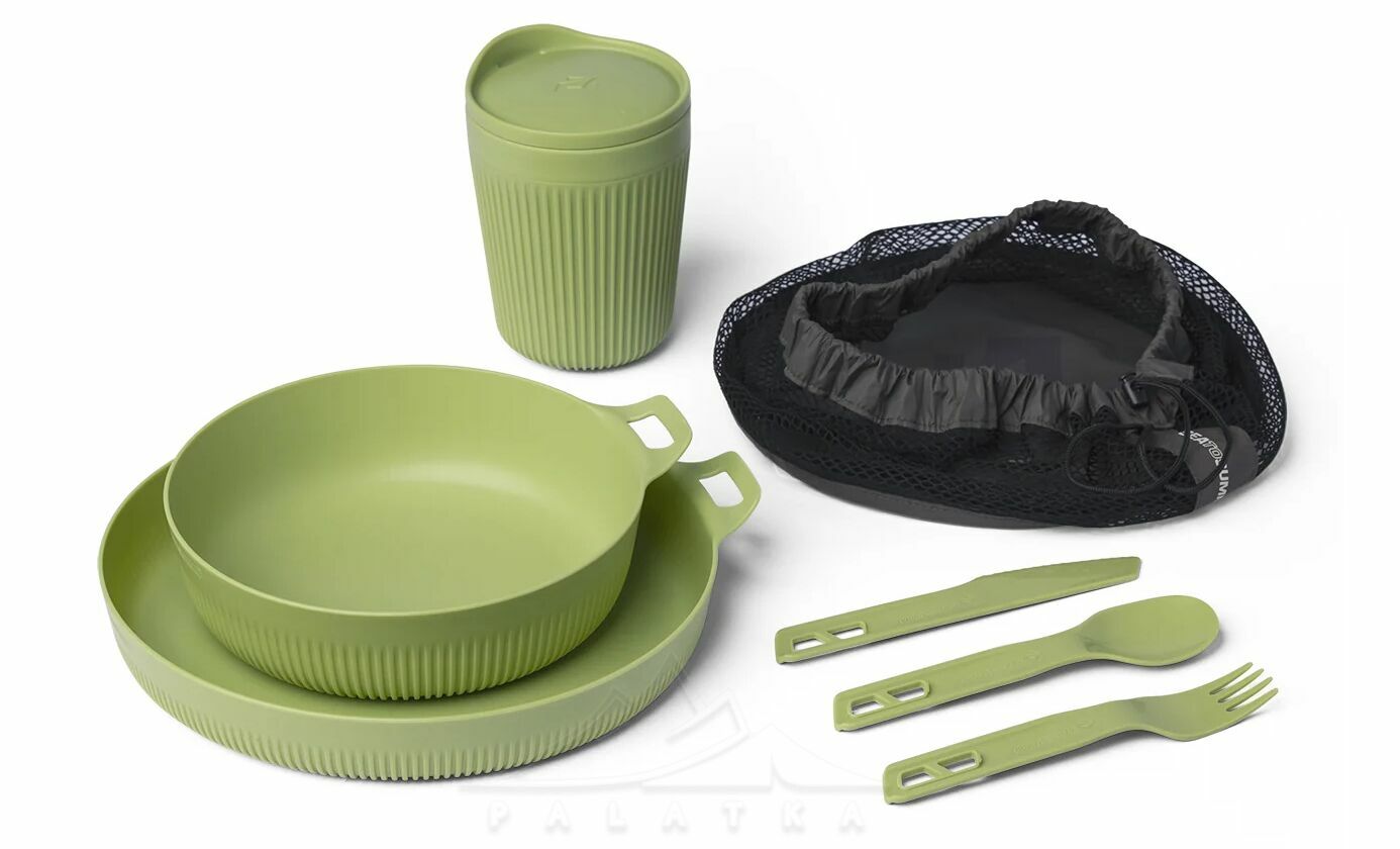 - У наборі вже є все основне для однієї людини: тарілка, миска, термостакан з кришкою, столові прибори та сітчастий мішок, тому для кемпінгу чи пікніка не потрібно збирати комплект по частинах.
