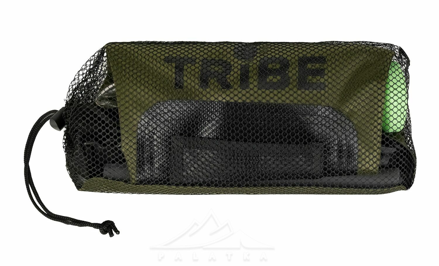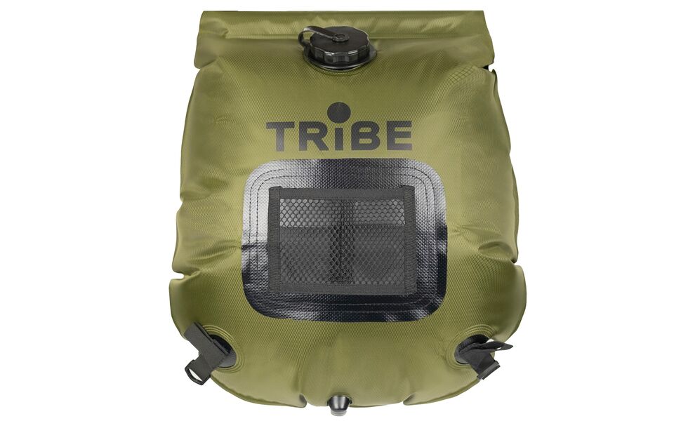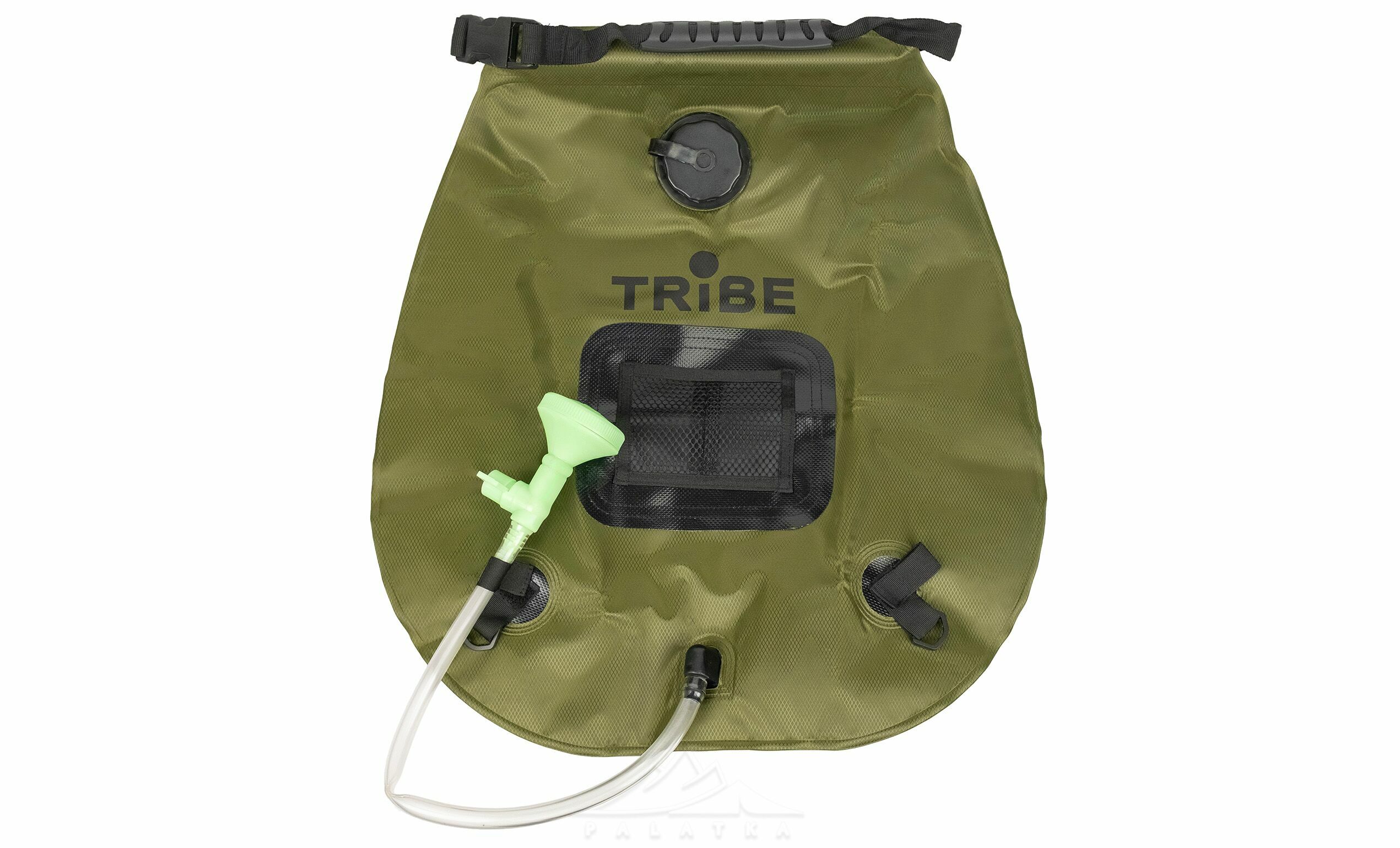 Ємність для душу Tribe Shower виготовлено з міцного ПВХ посиленого армованим плетінням Ripstop. Для закріплення ємність обладнано стропою з ручкою, з однієї сторони якої розміщено фастекс. Одна зі сторін прозора, що дозволяє оцінювати залишковий рівень води. Внутрішня частина іншої сторони – чорна, що пришвидшує нагрівання води на сонці. На прозорій стороні ємності розміщено термометр для відслідковування приблизної температури води. Кришку від горловини прикріплено до ємності, що робить процес заливання води комфортнішим. У комплекті постачається шланг з розпилювачем, який обладнано краном.