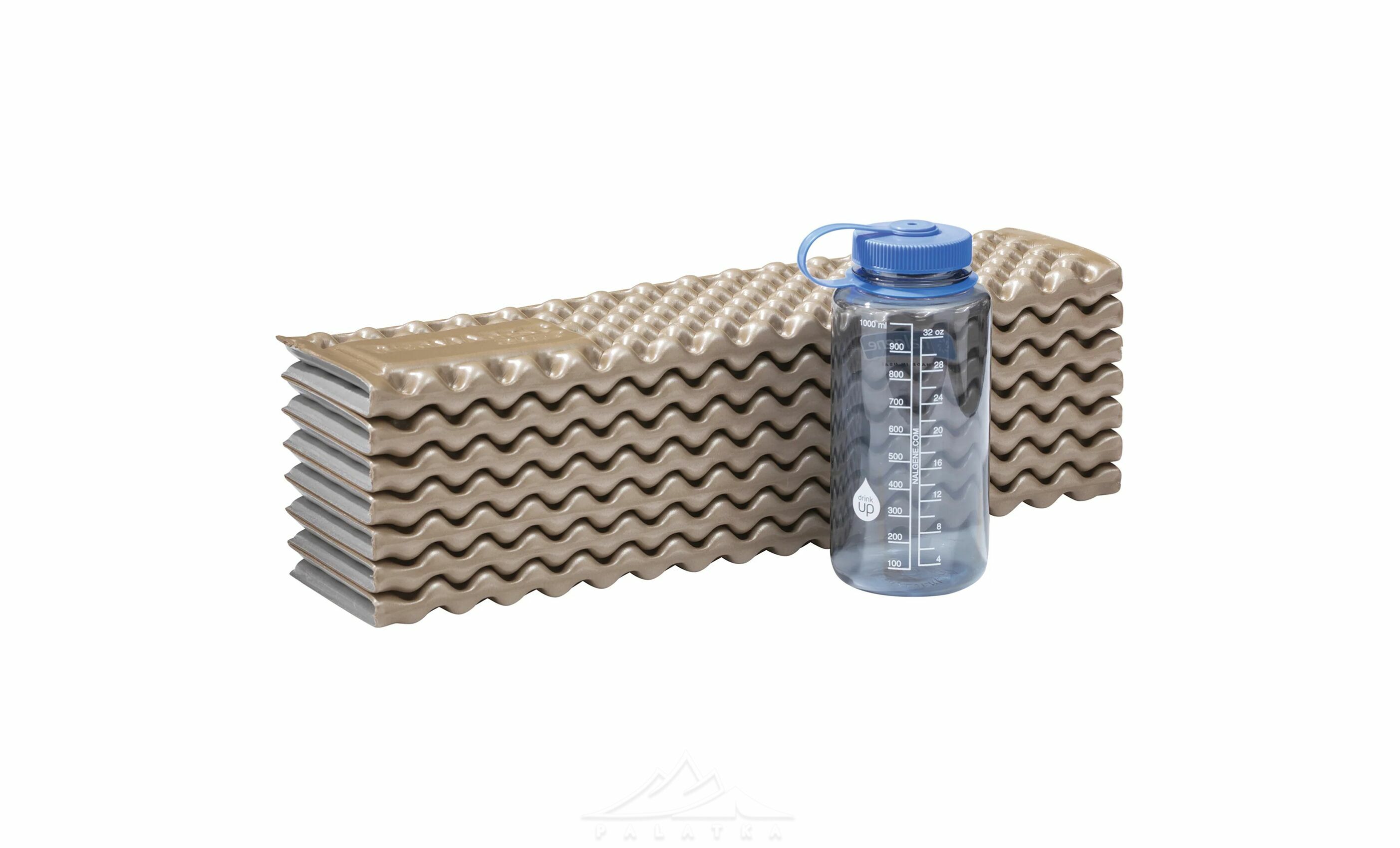 - В складеному вигляді має більш компактний розмір, ніж звичайний каремат, який скручується. Його можна легко приєднати зверху або збоку до похідного рюкзака.