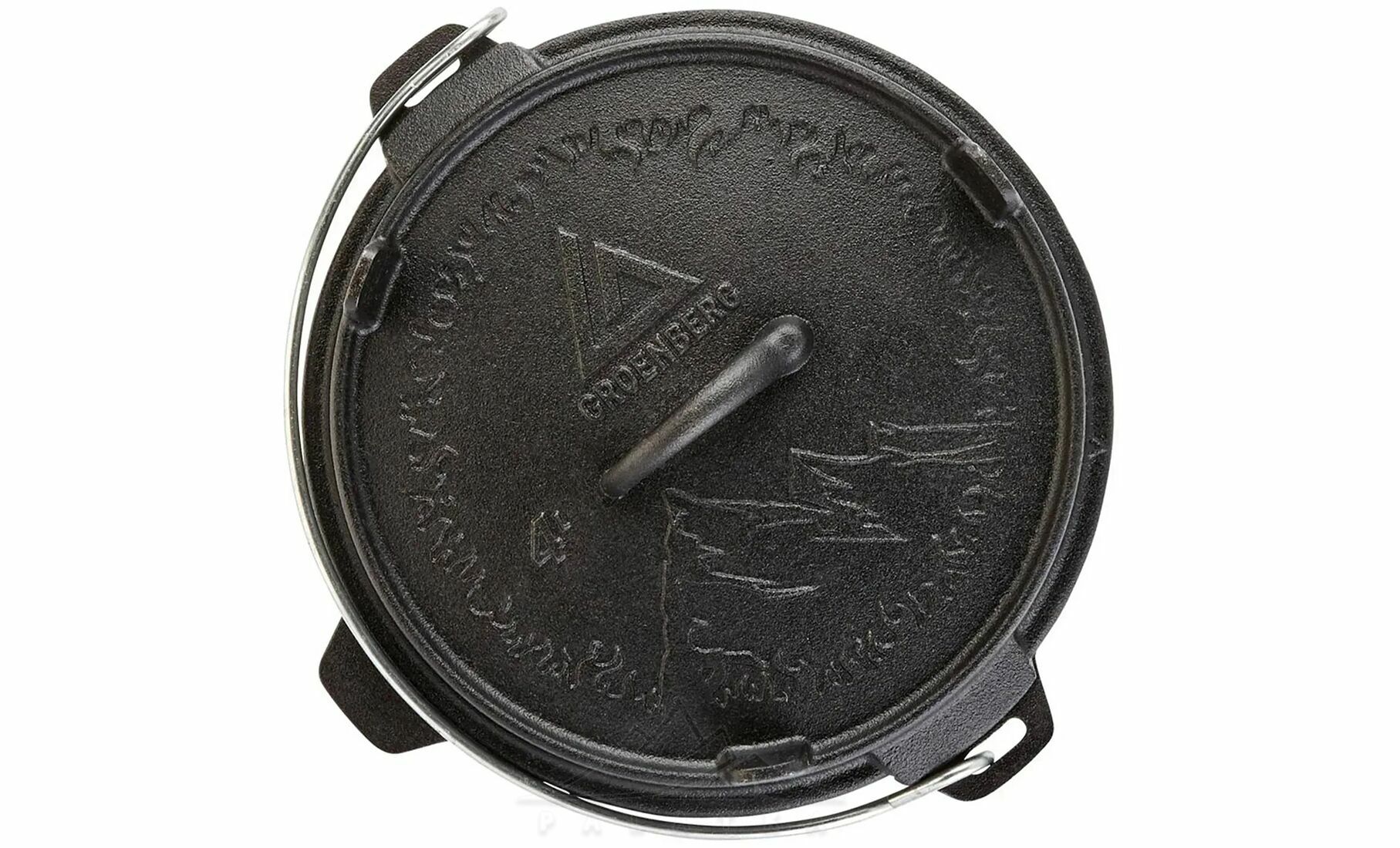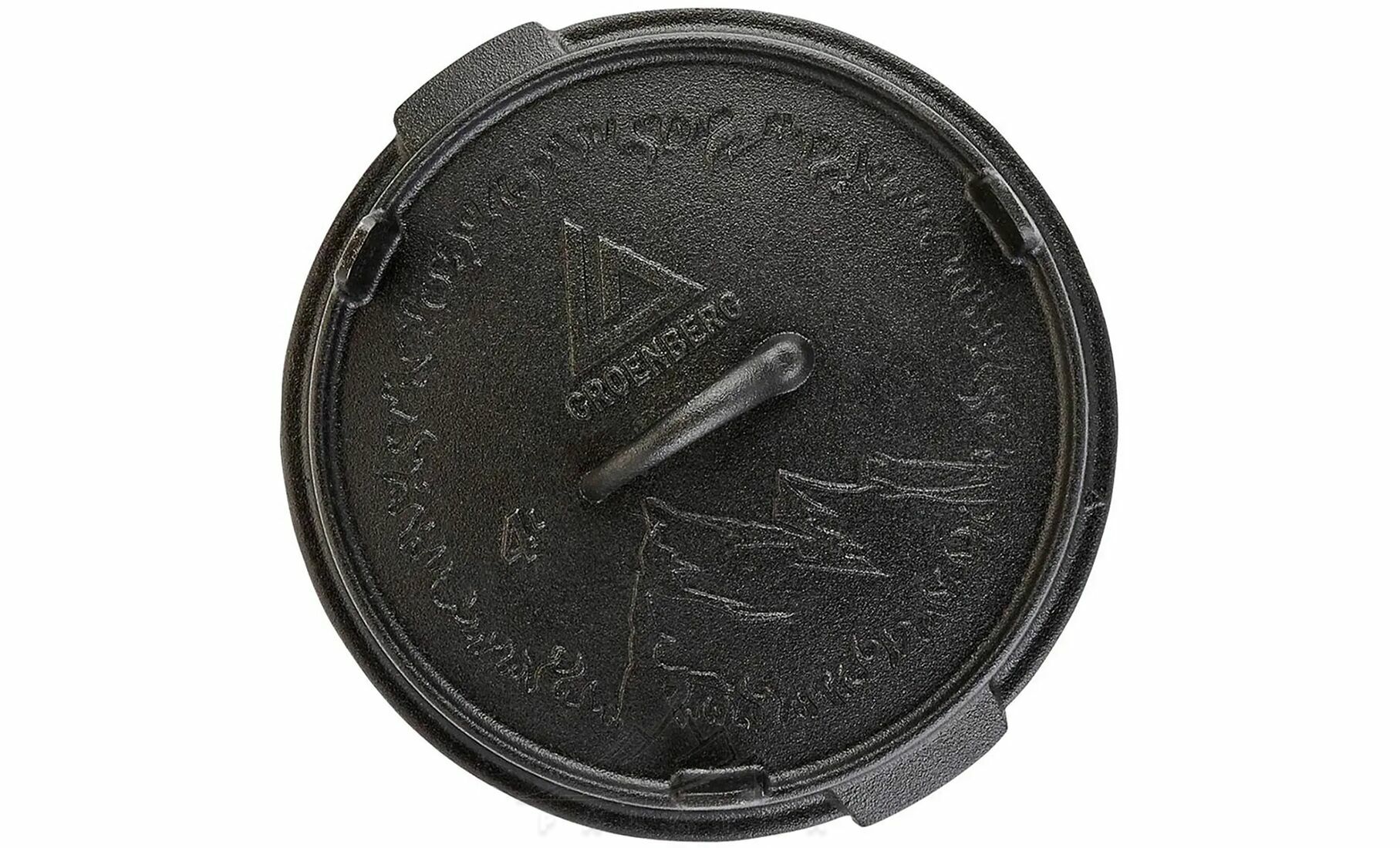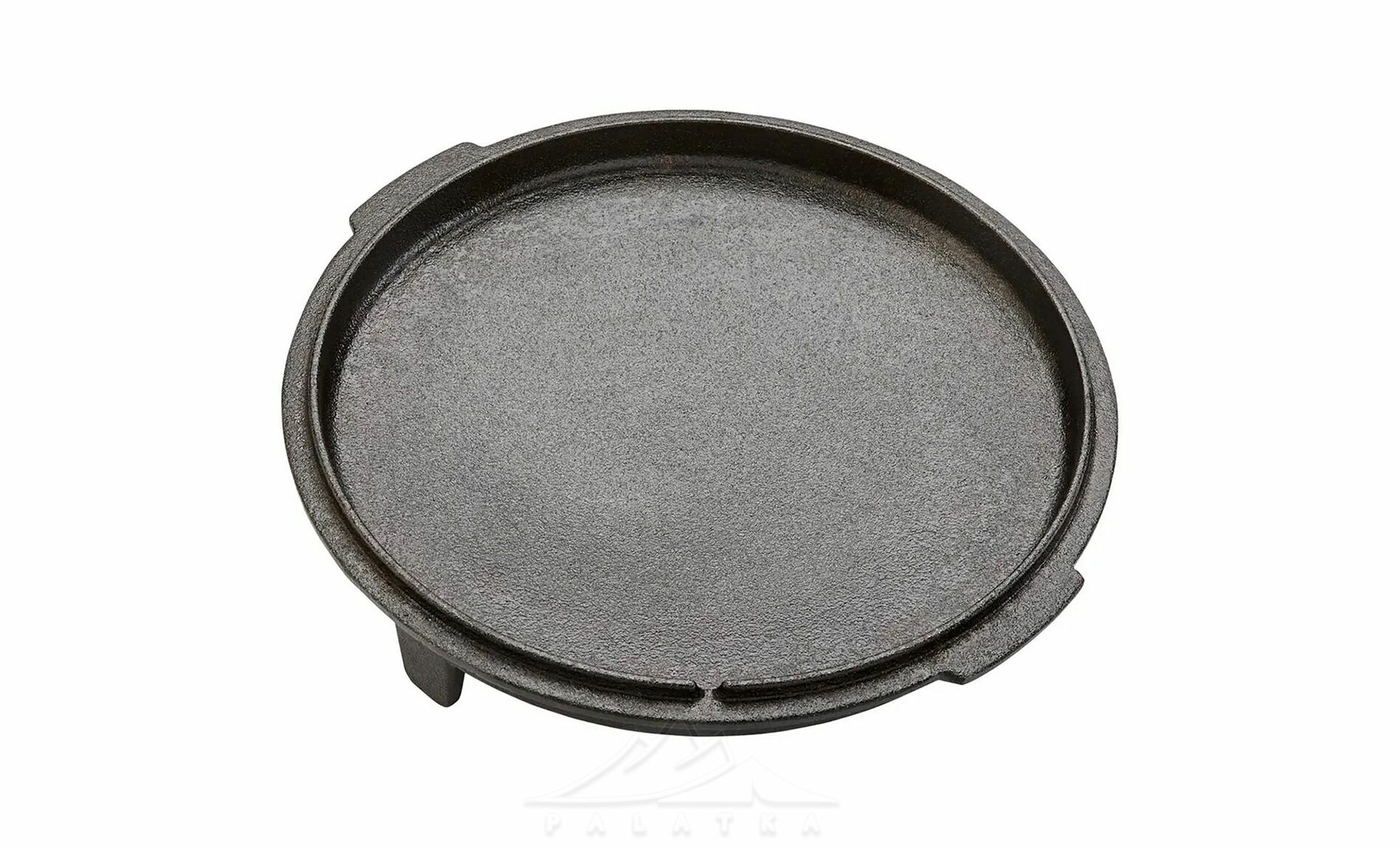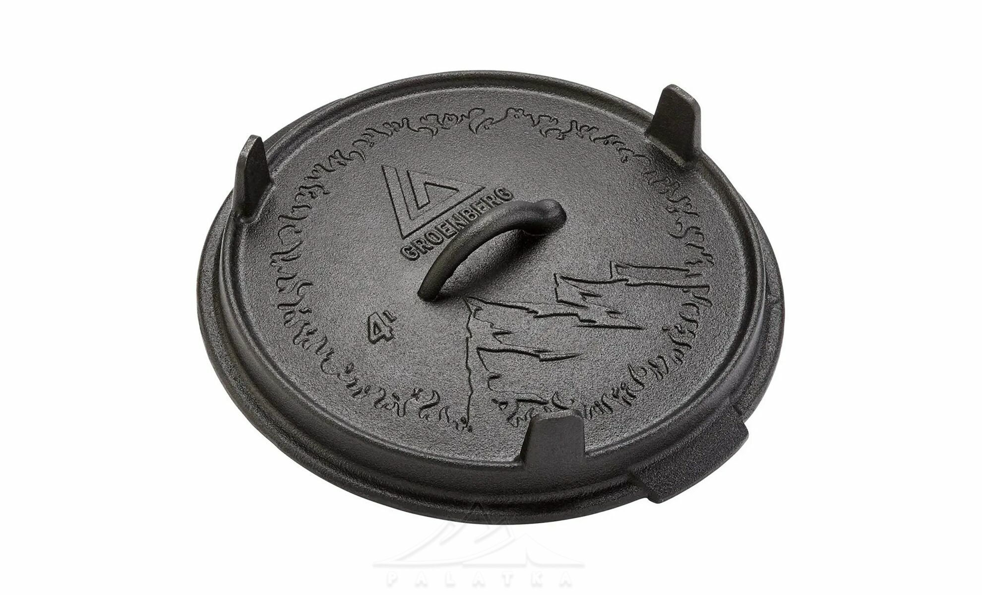 • Функціональна кришка з ніжками, що використовується як сковорідка або сервірувальна тарілка, та забезпечує стійке встановлення прямо на вогнищі або вугіллі.
