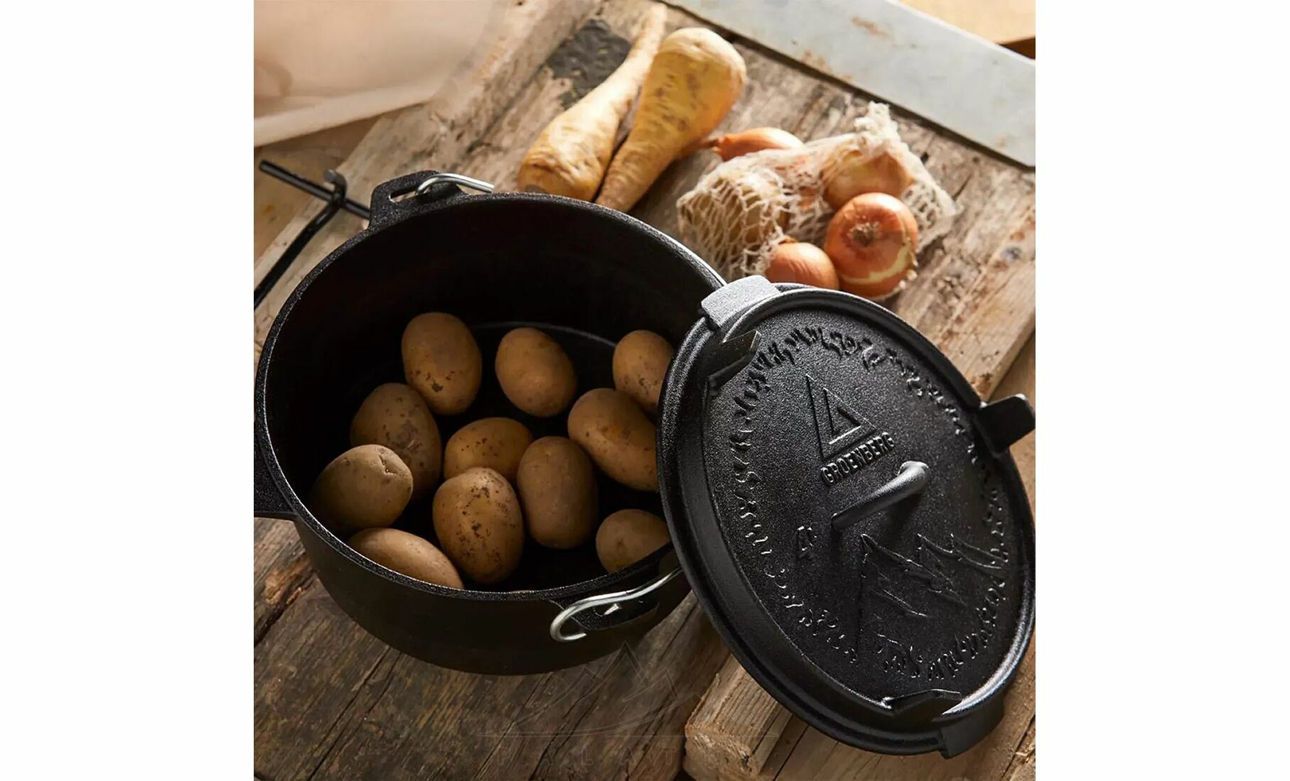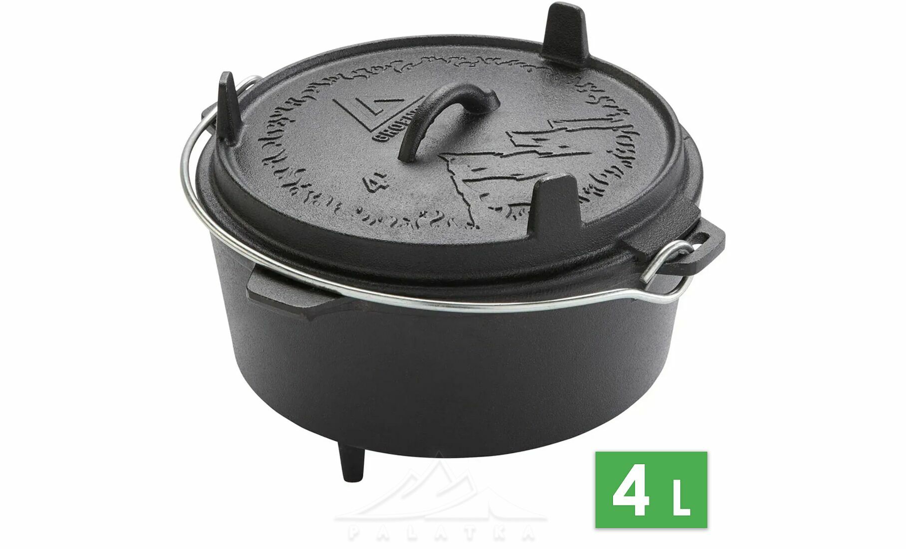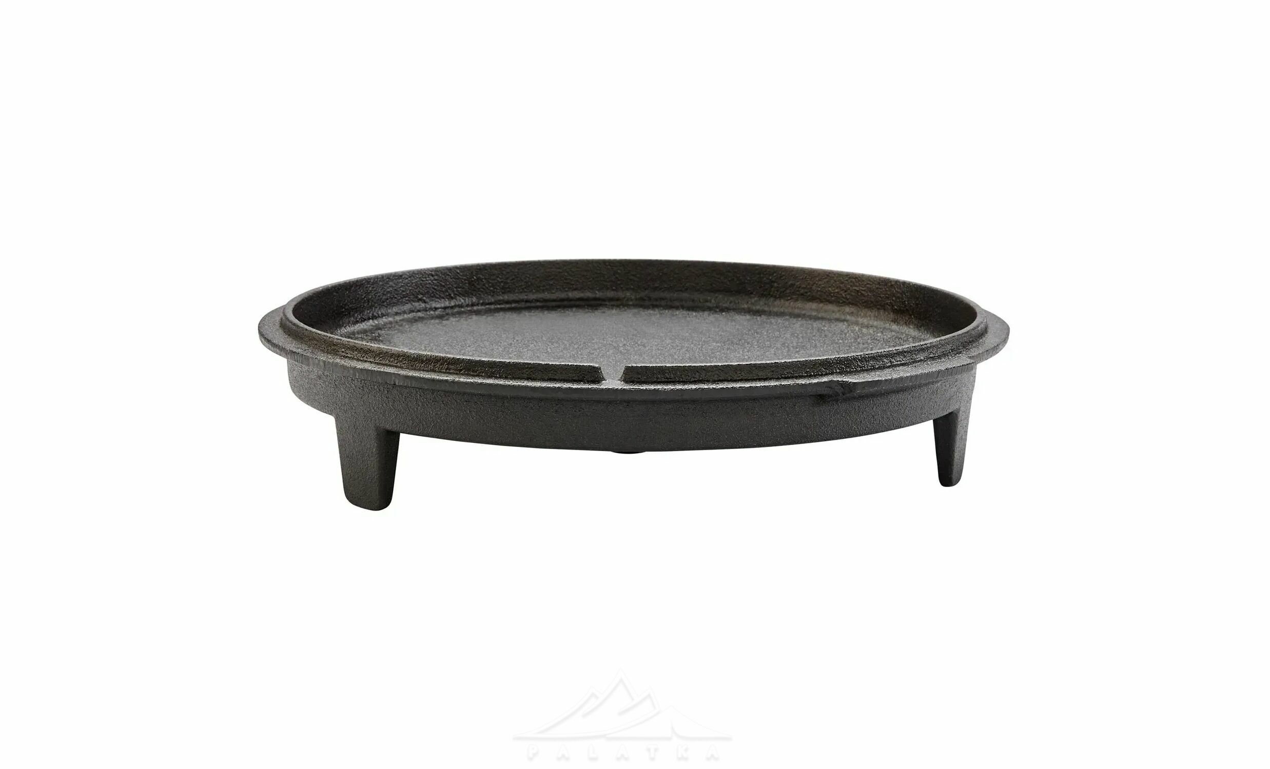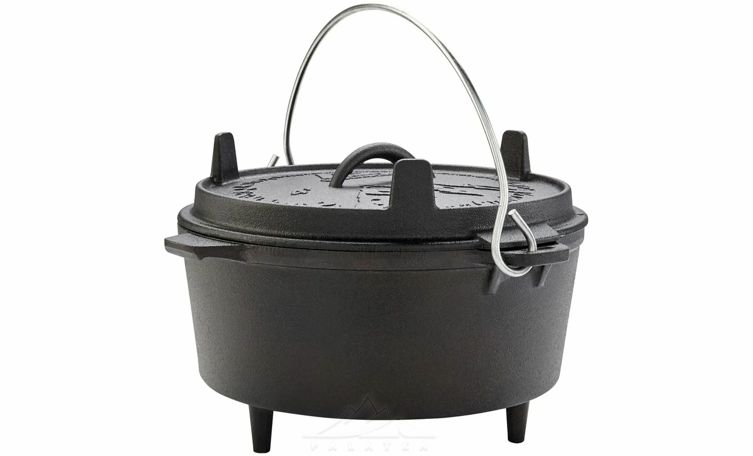 • Функціональна кришка з ніжками, що використовується як сковорідка або сервірувальна тарілка, та забезпечує стійке встановлення прямо на вогнищі або вугіллі.