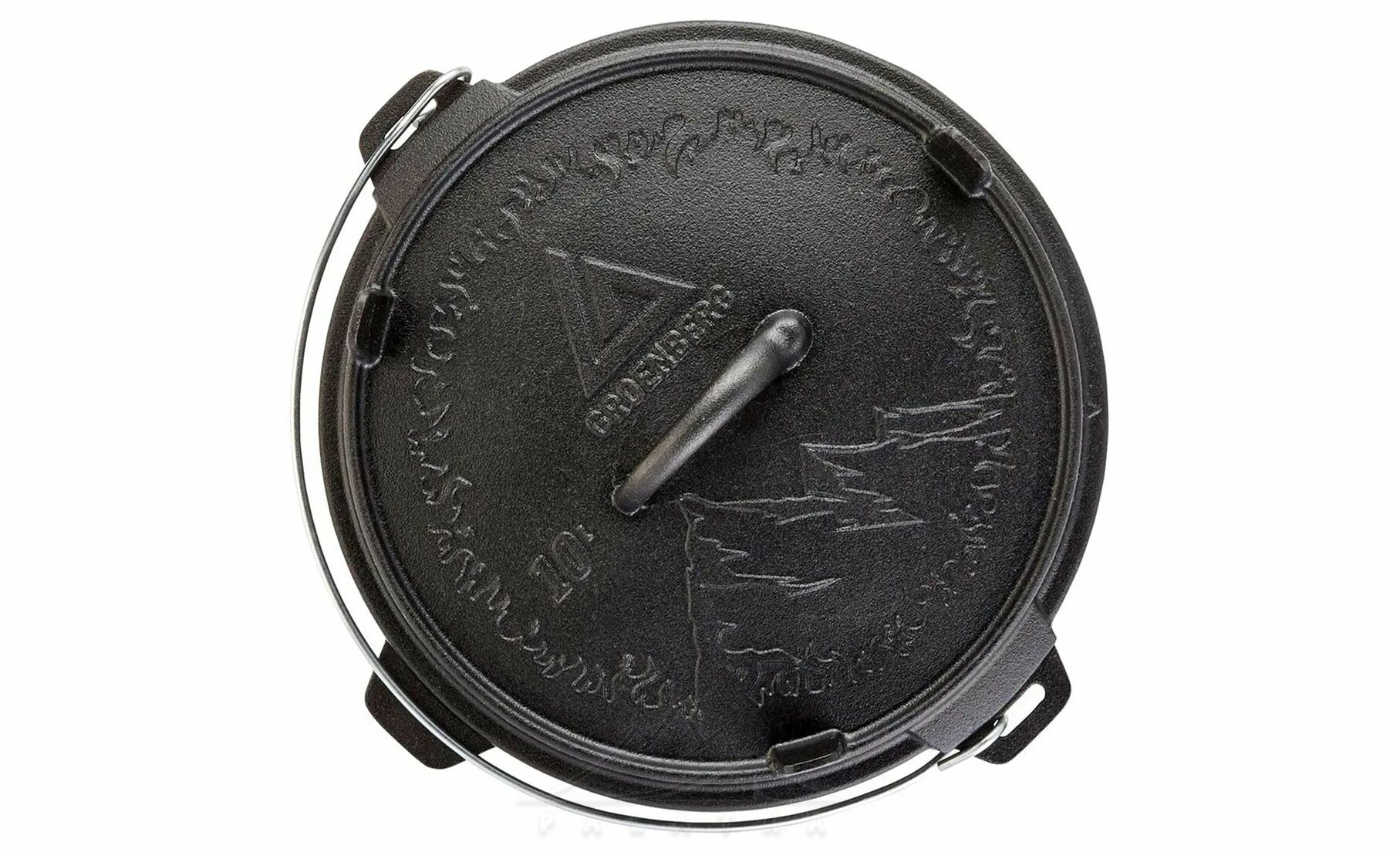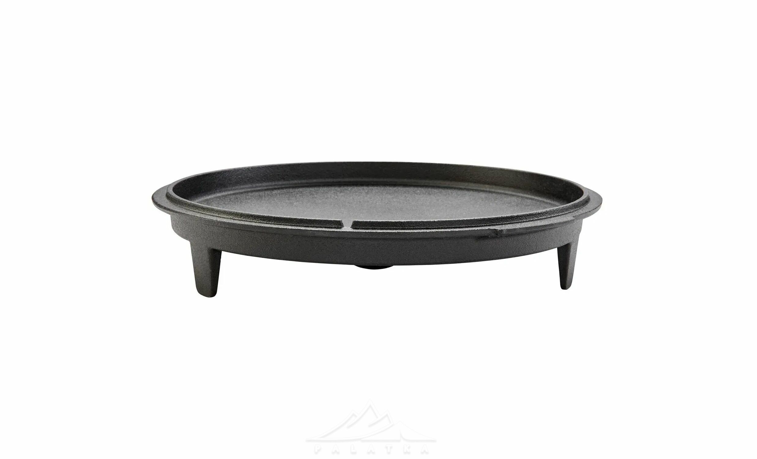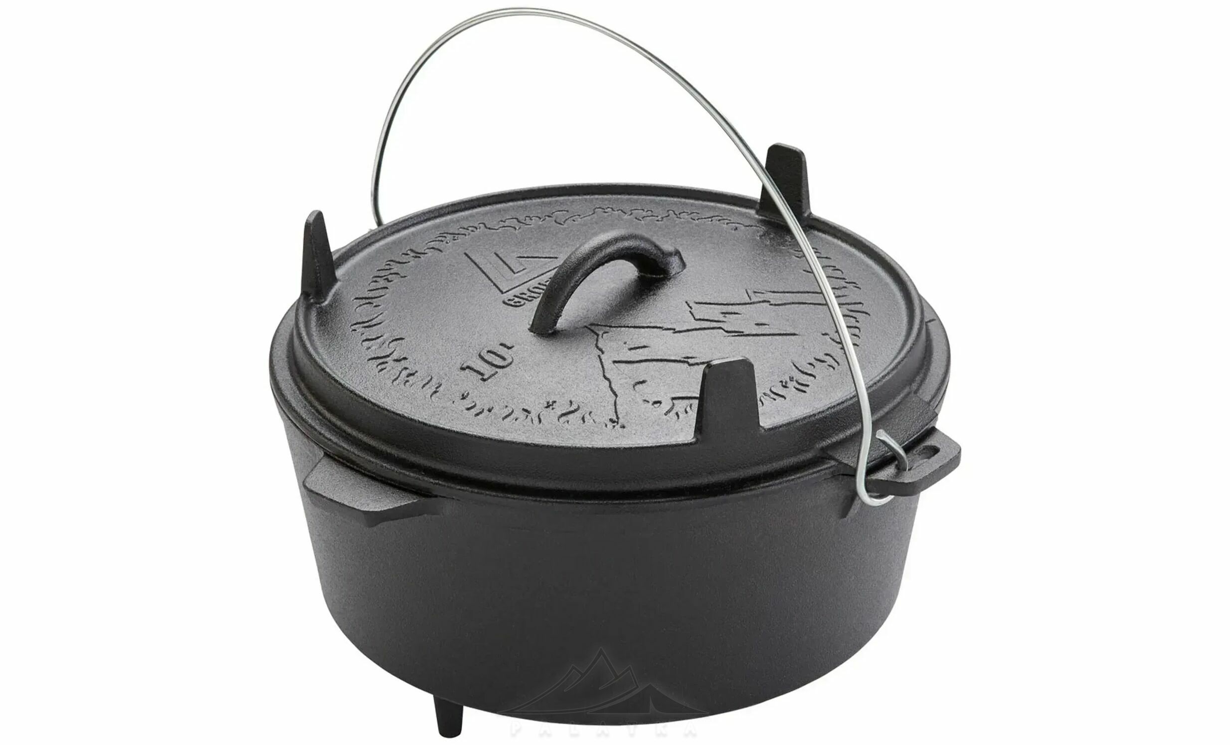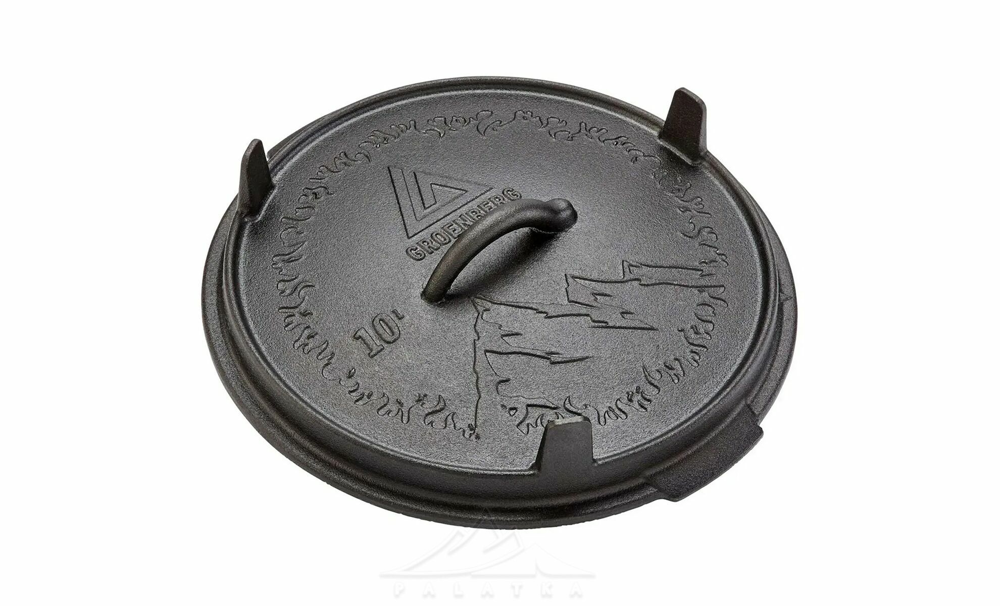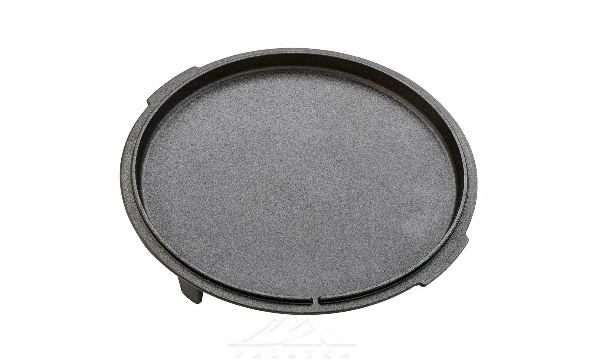 - Функціональна кришка з ніжками, що використовується як сковорідка або сервірувальна тарілка, та забезпечує стійке встановлення прямо на вогнищі або вугіллі.