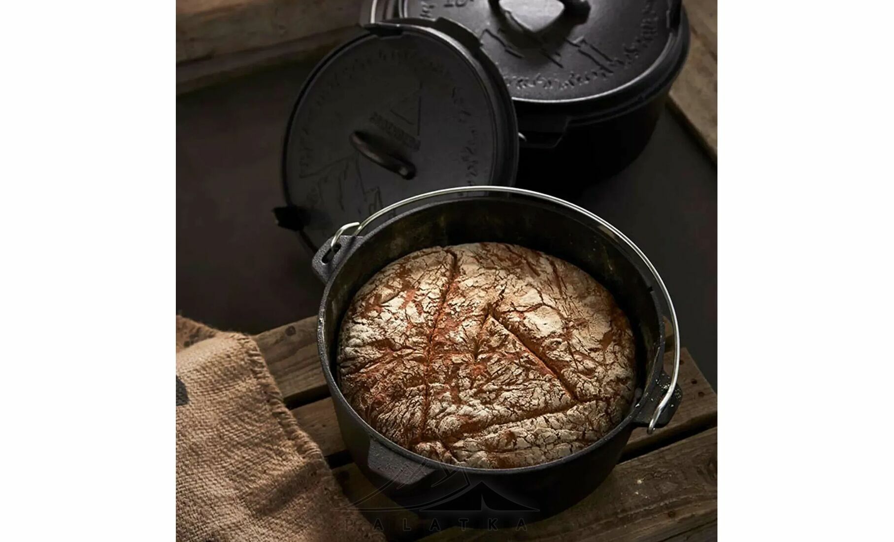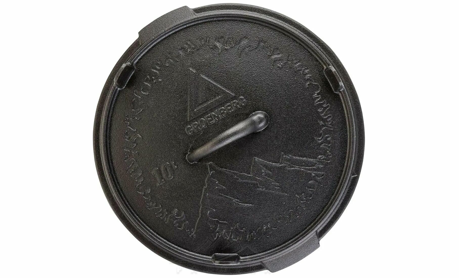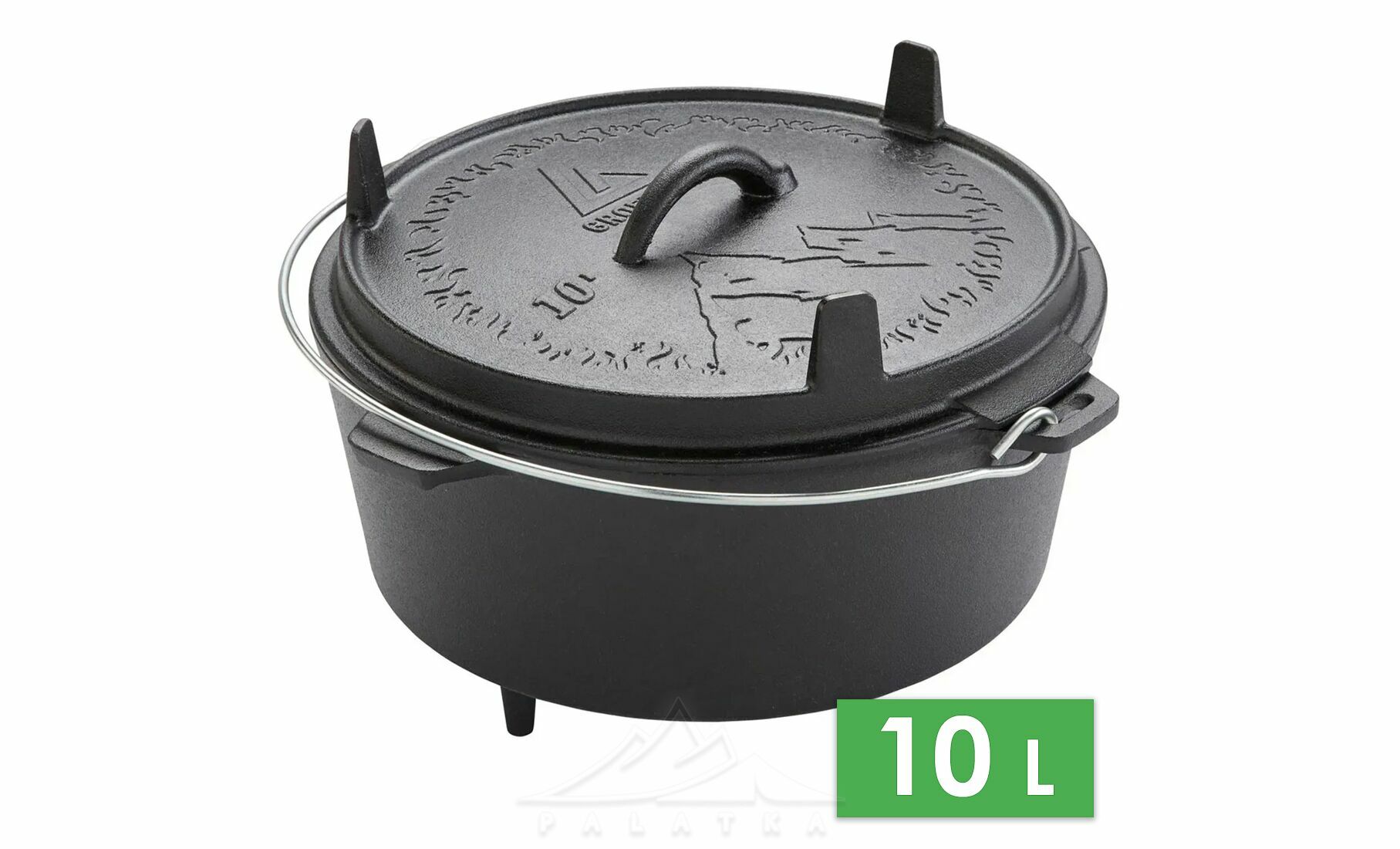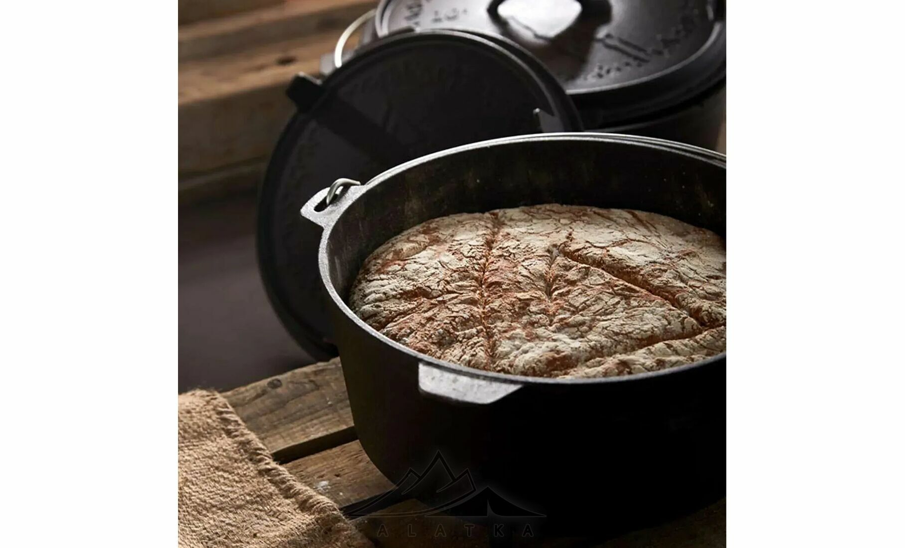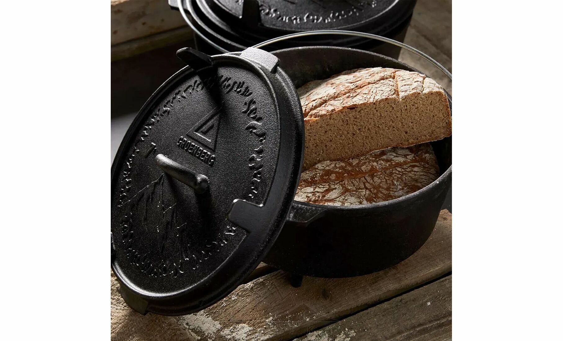- Функціональна кришка з ніжками, що використовується як сковорідка або сервірувальна тарілка, та забезпечує стійке встановлення прямо на вогнищі або вугіллі.