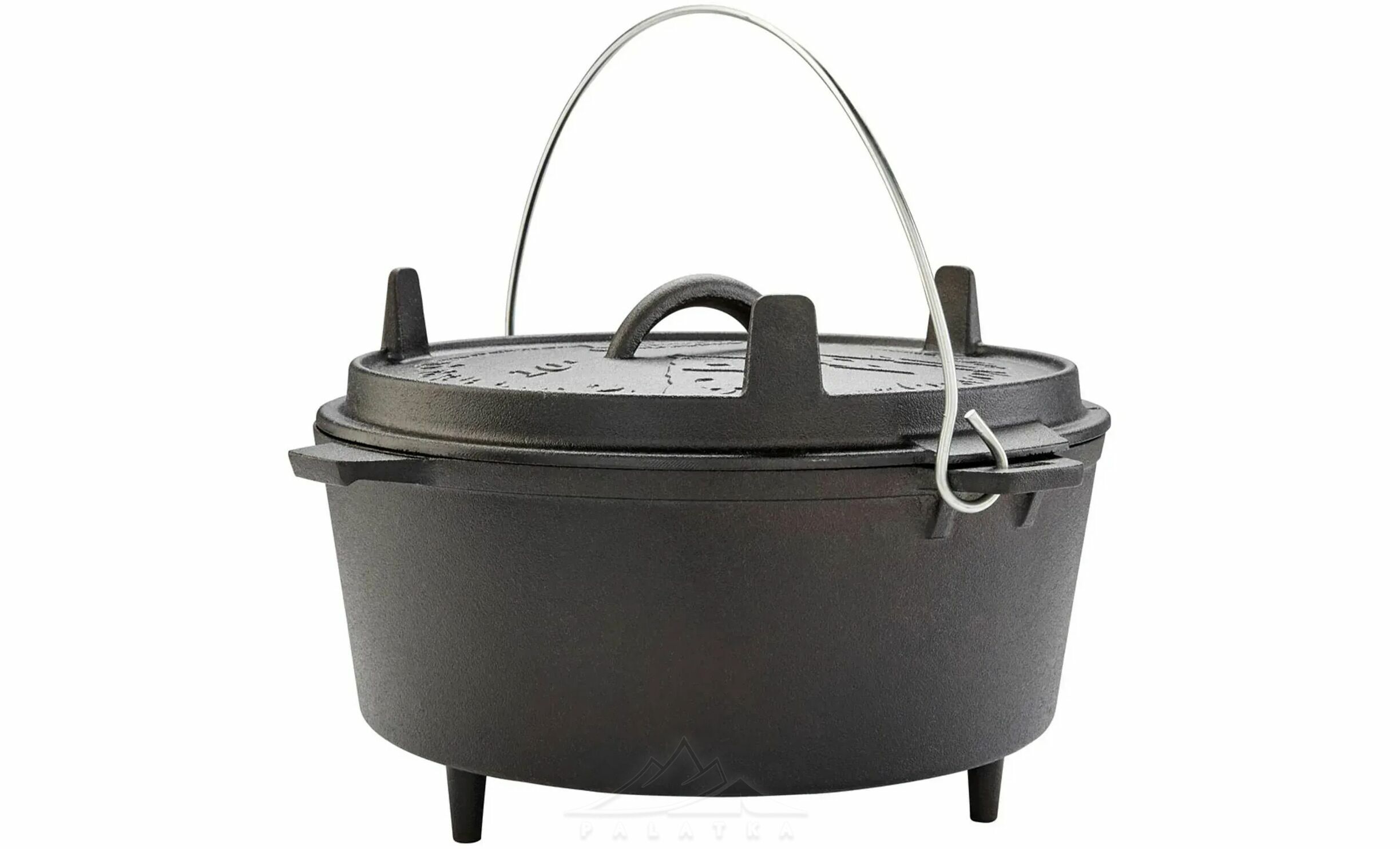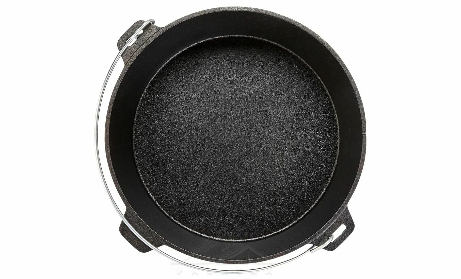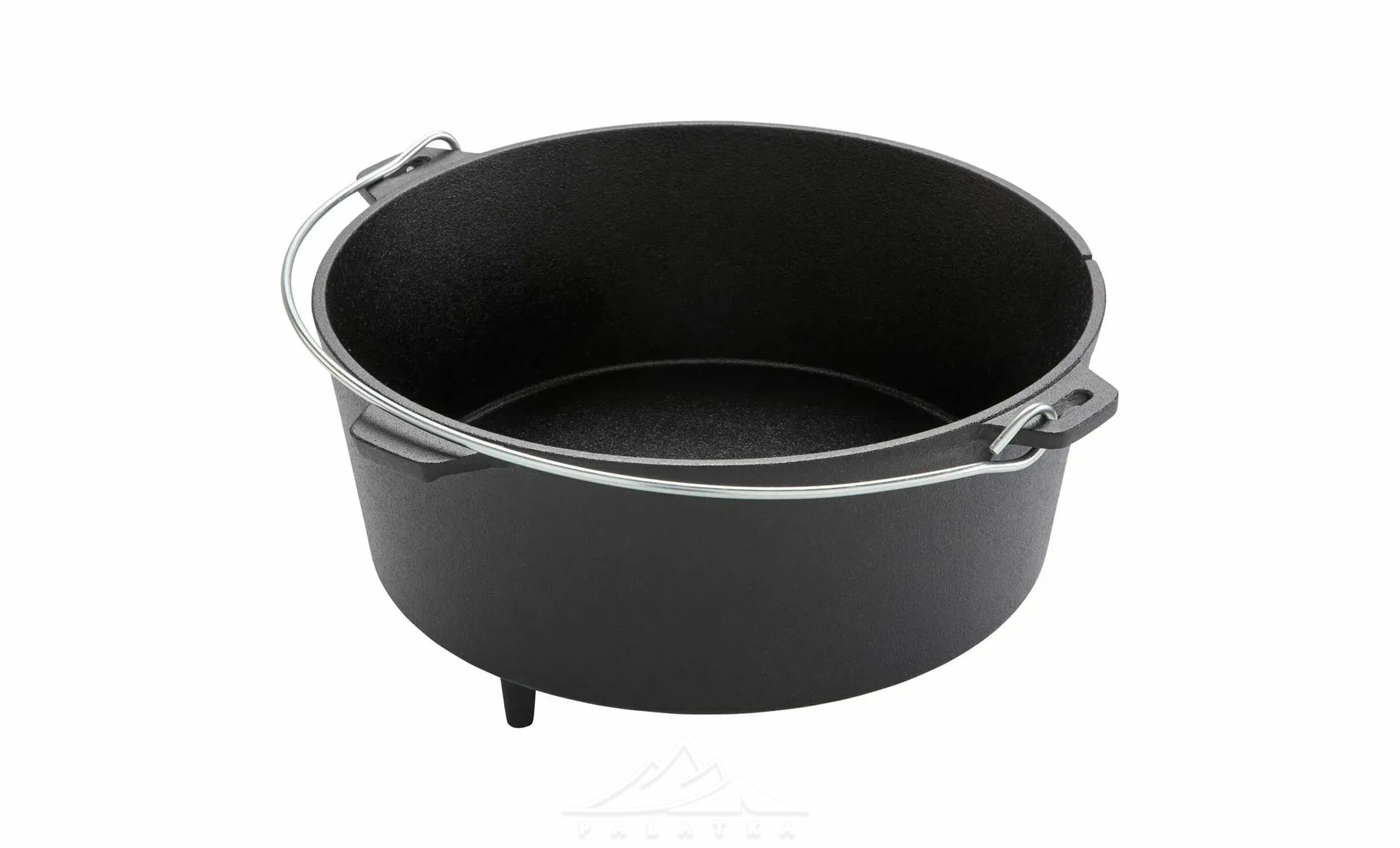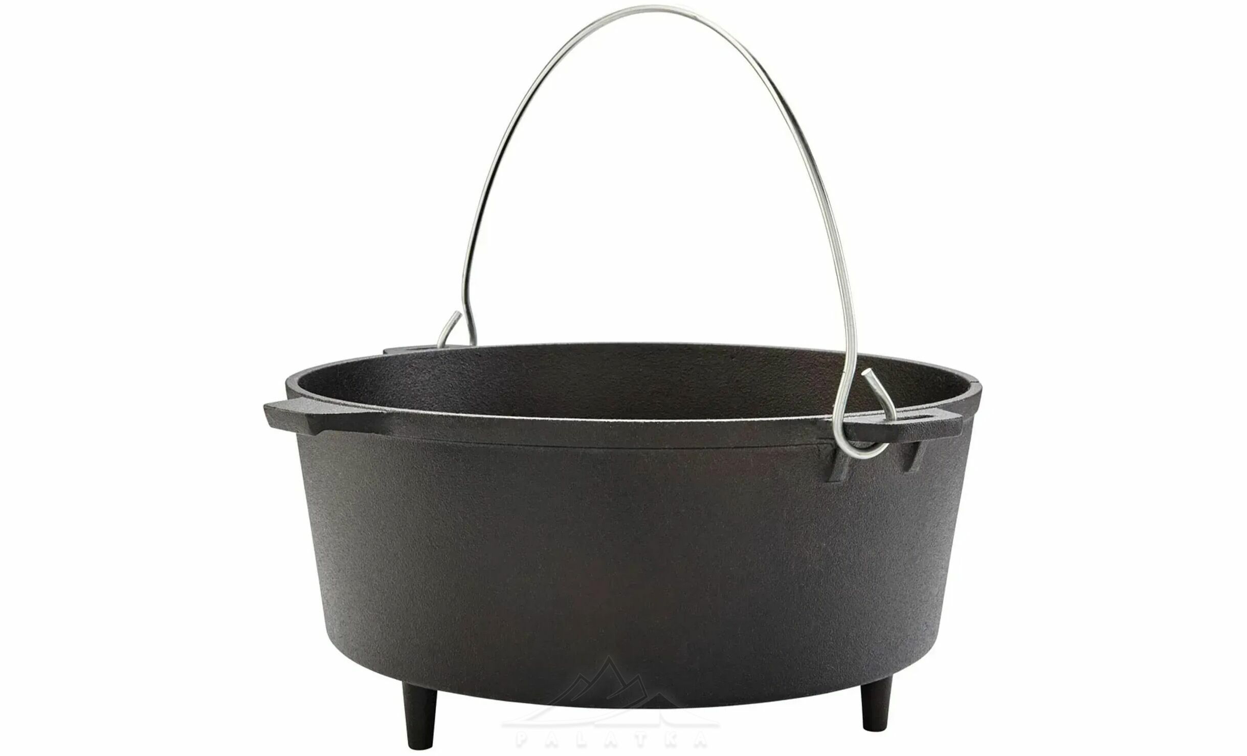 - Бічні невеликі литі ручки з чавуну для зручного перенесення, та велика міцна сталева ручка, яка дозволяє підвішувати казан над вогнищем чи закріпити його на тринозі.