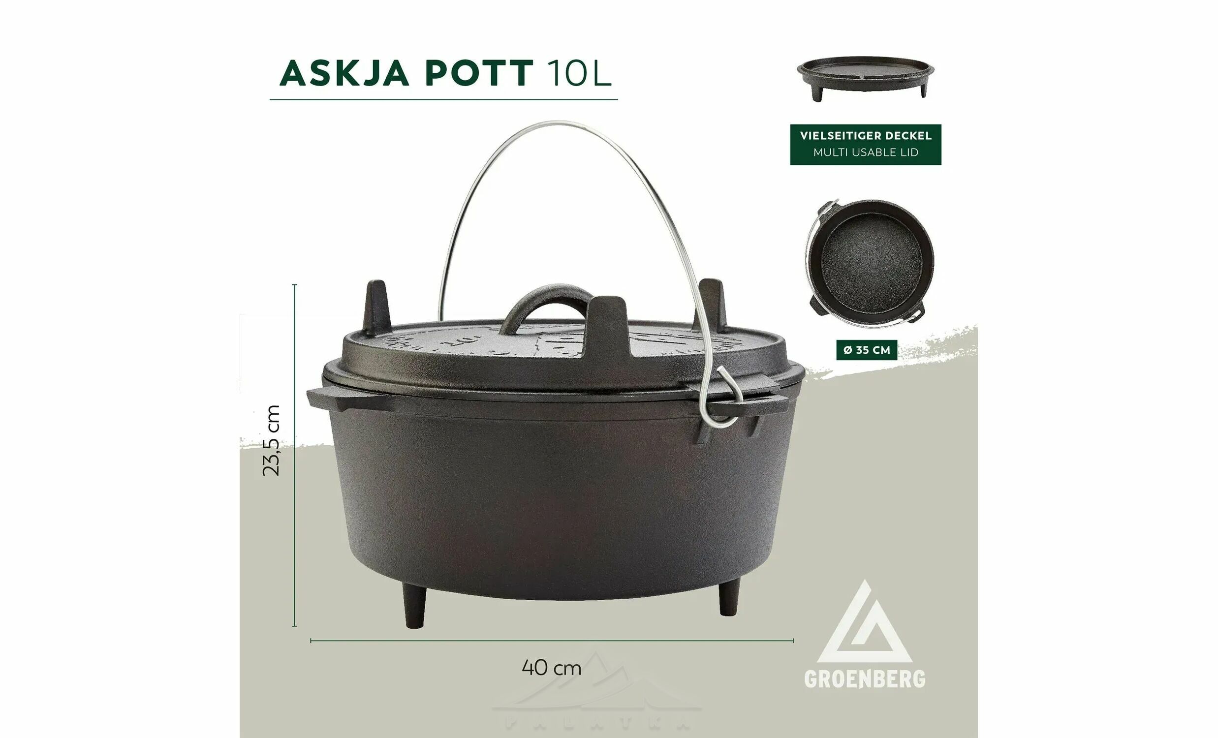 Groenberg Askja Pot — багатофункціональний казан із литого чавуну, створений для приготування їжі як на природі, так і вдома. Чудово підходить для запікання, тушкування, смаження, варіння або випічки.