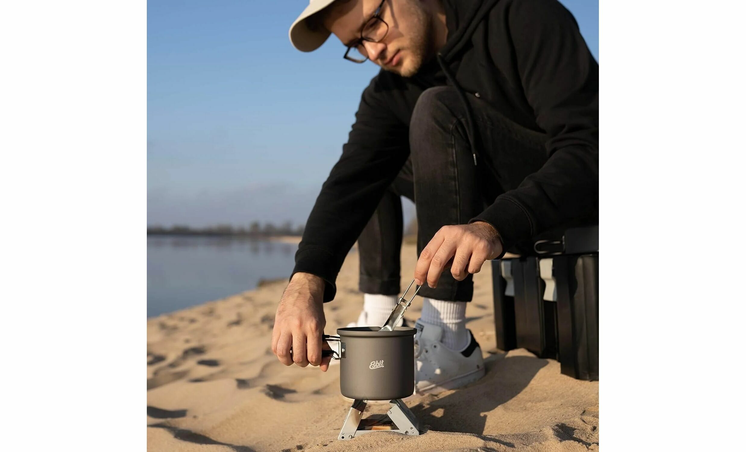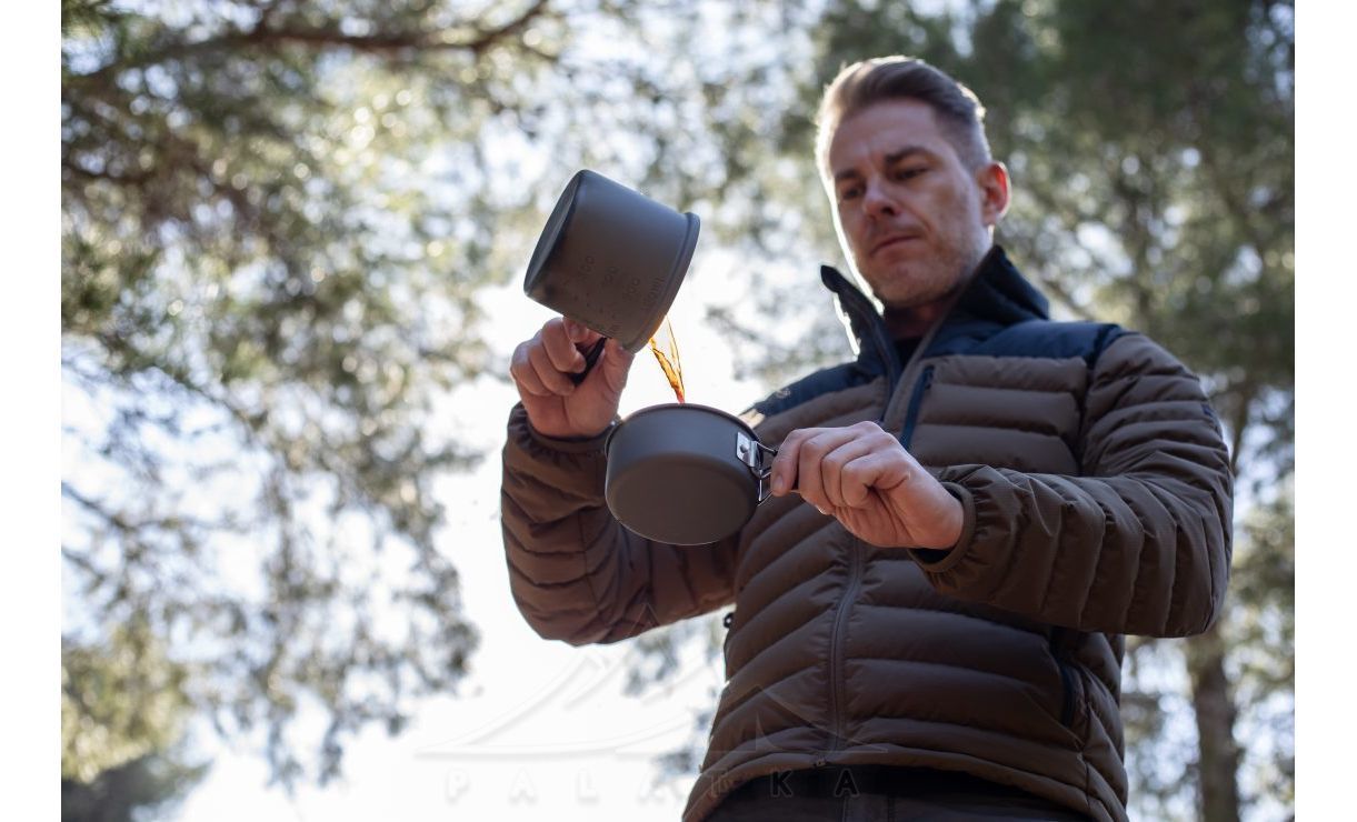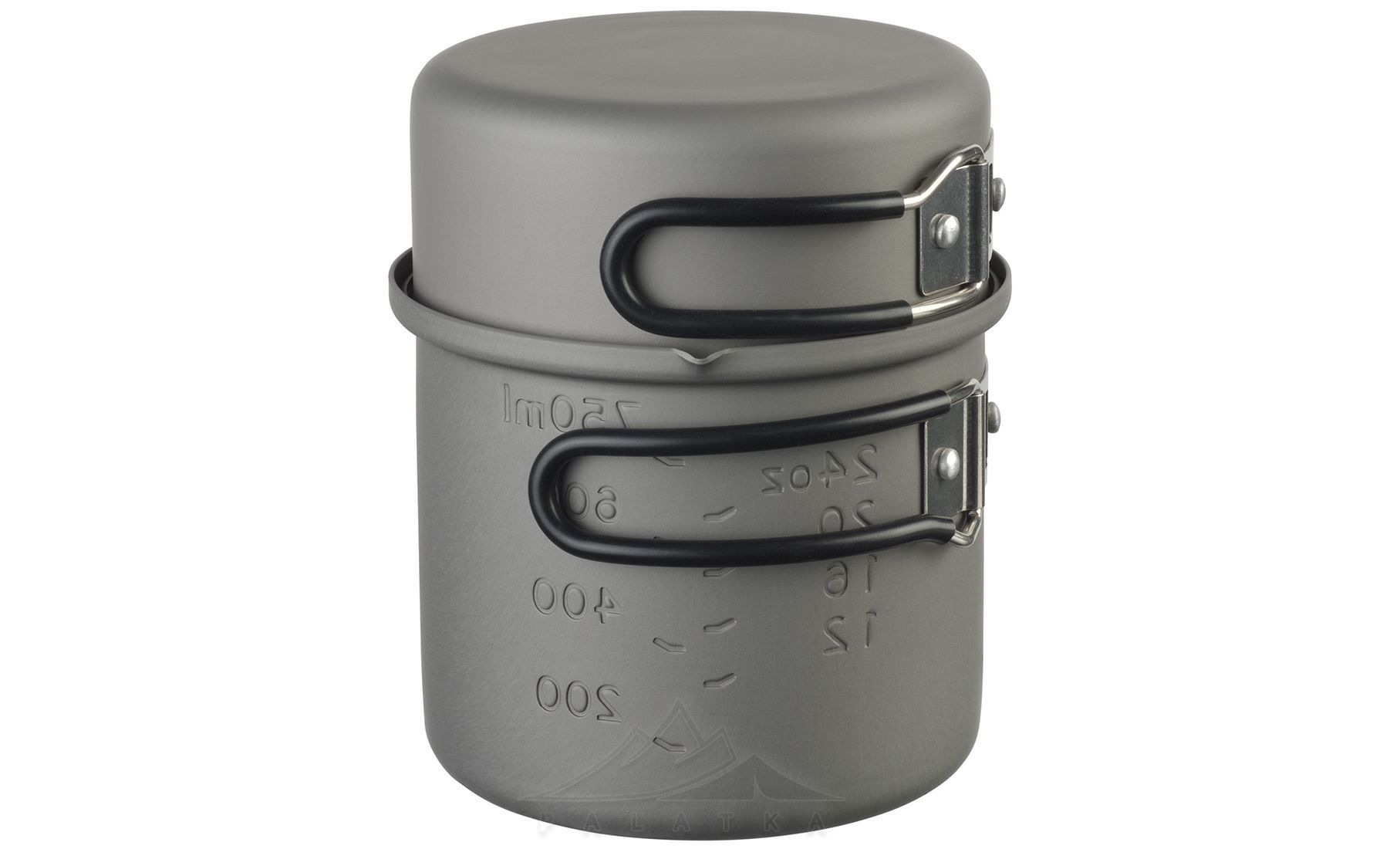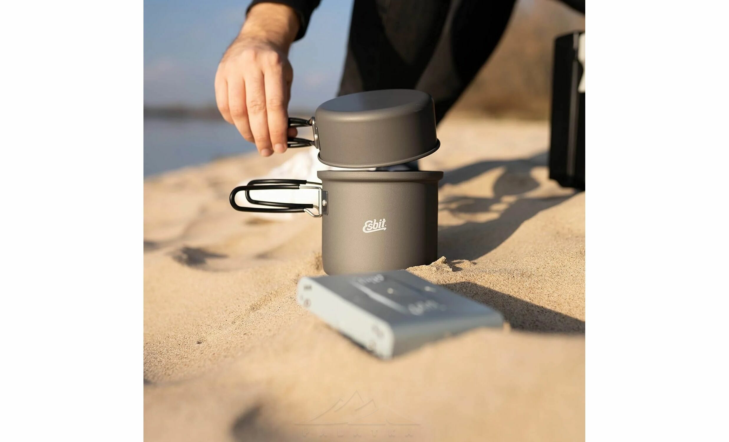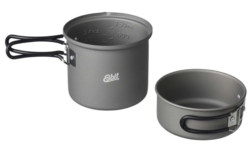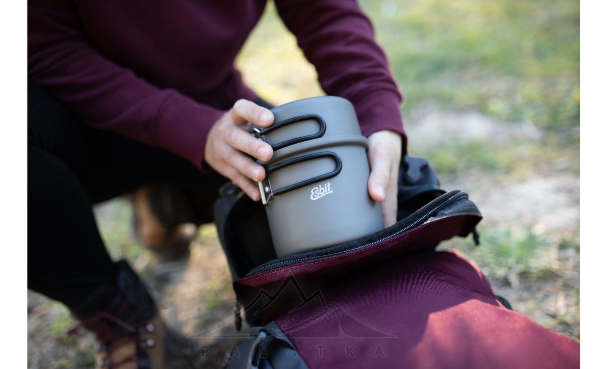 Esbit PT1000HA — компактний набір посуду з легкого анодованого алюмінію зі складними термостійкими ручками для приготування під час походів та кемпінгу. Підійде для 1-2 осіб.