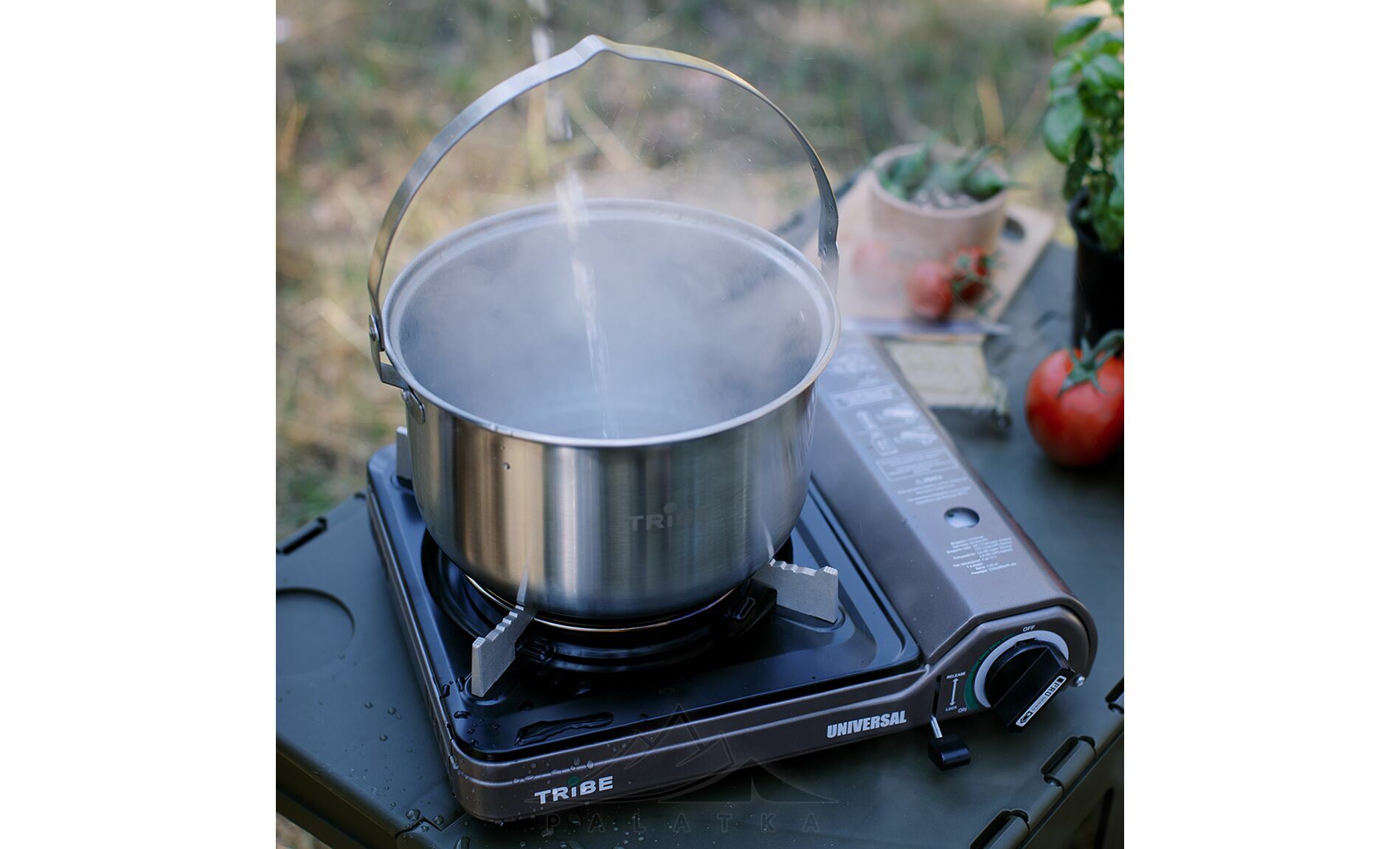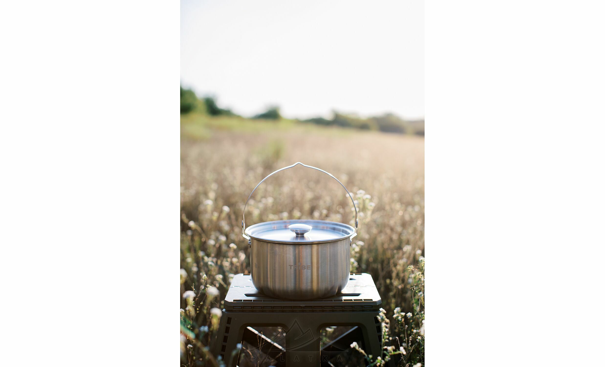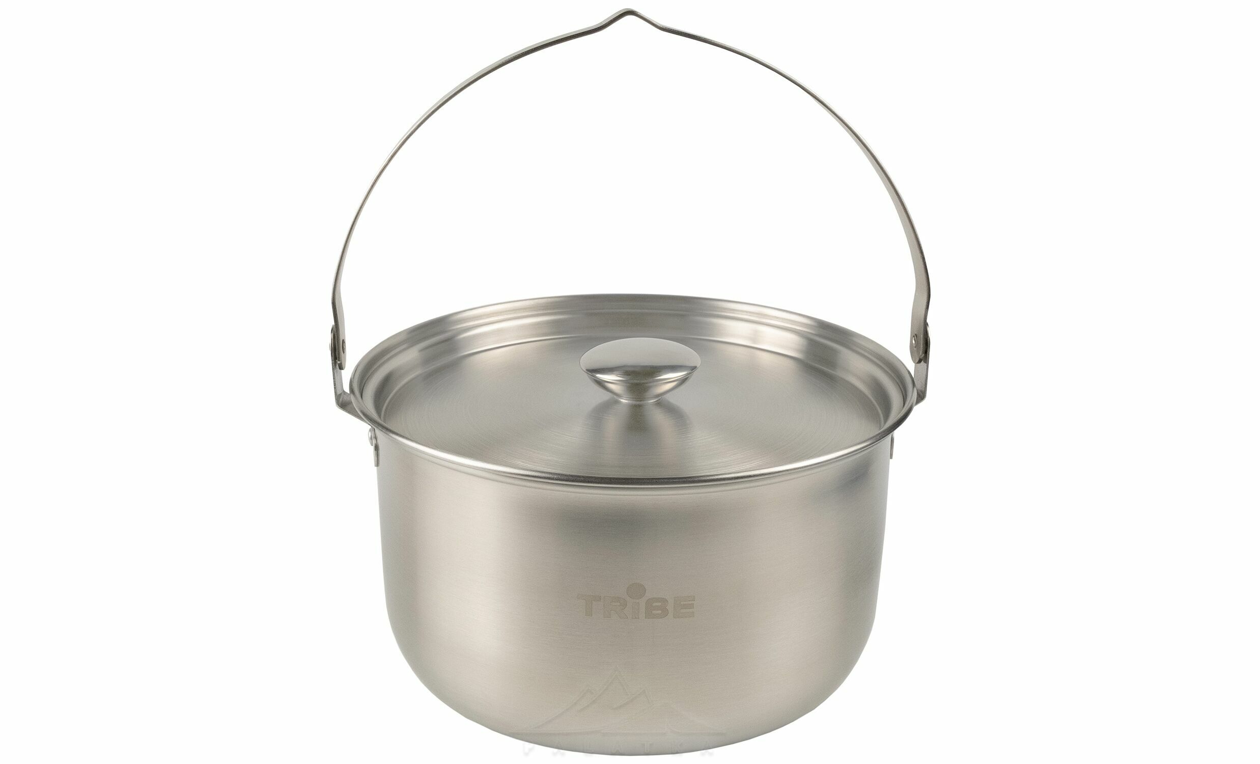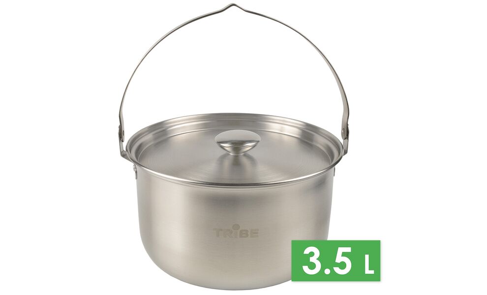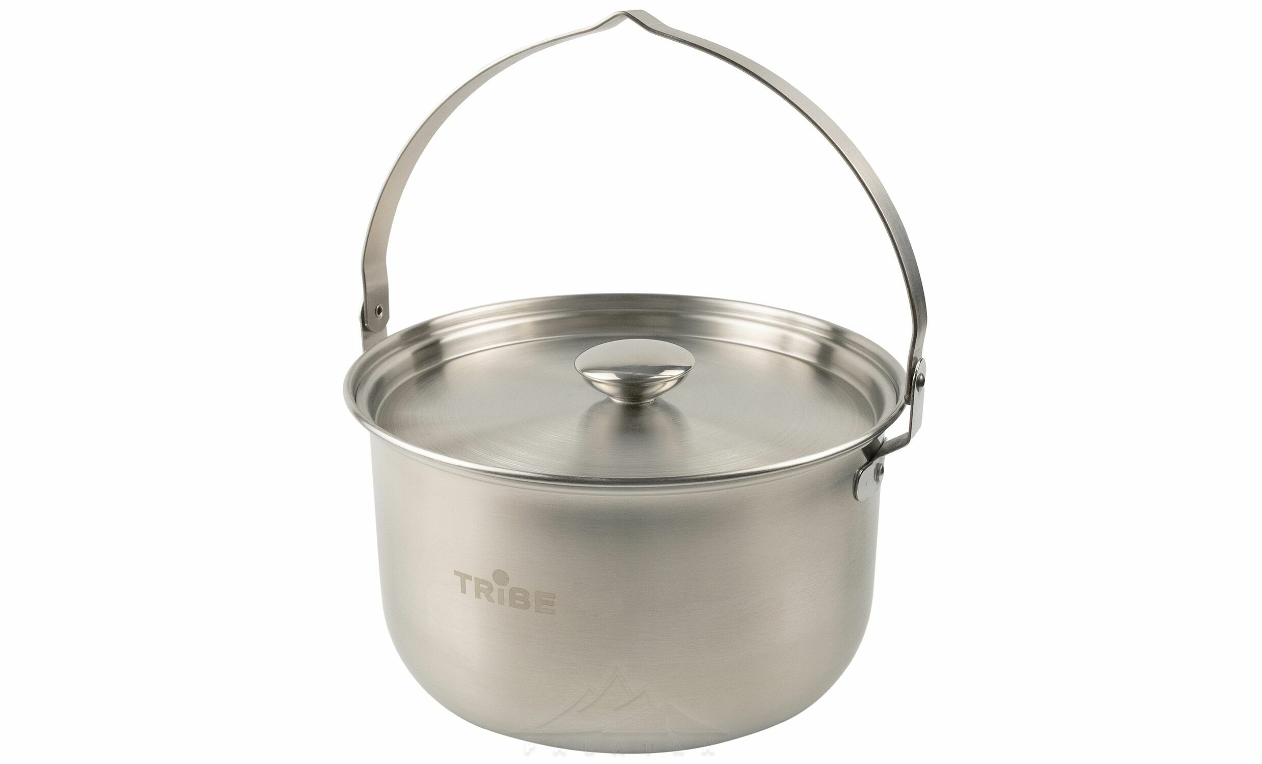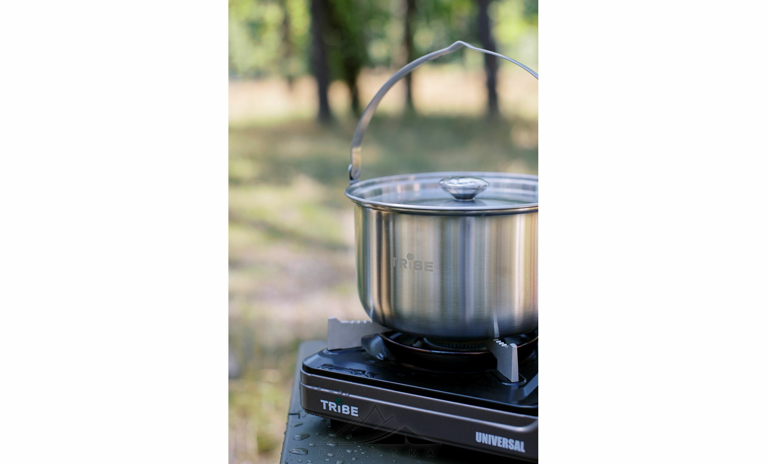 Tribe T-FH-0005 Family Pot — це універсальний казанок з харчової нержавіючої сталі, створений для приготування їжі на природі: у походах, кемпінгу чи на пікніку. Підходить для використання на відкритому вогні, пальнику або плиті, а зручна ручка дозволяє підвісити його над вогнищем.