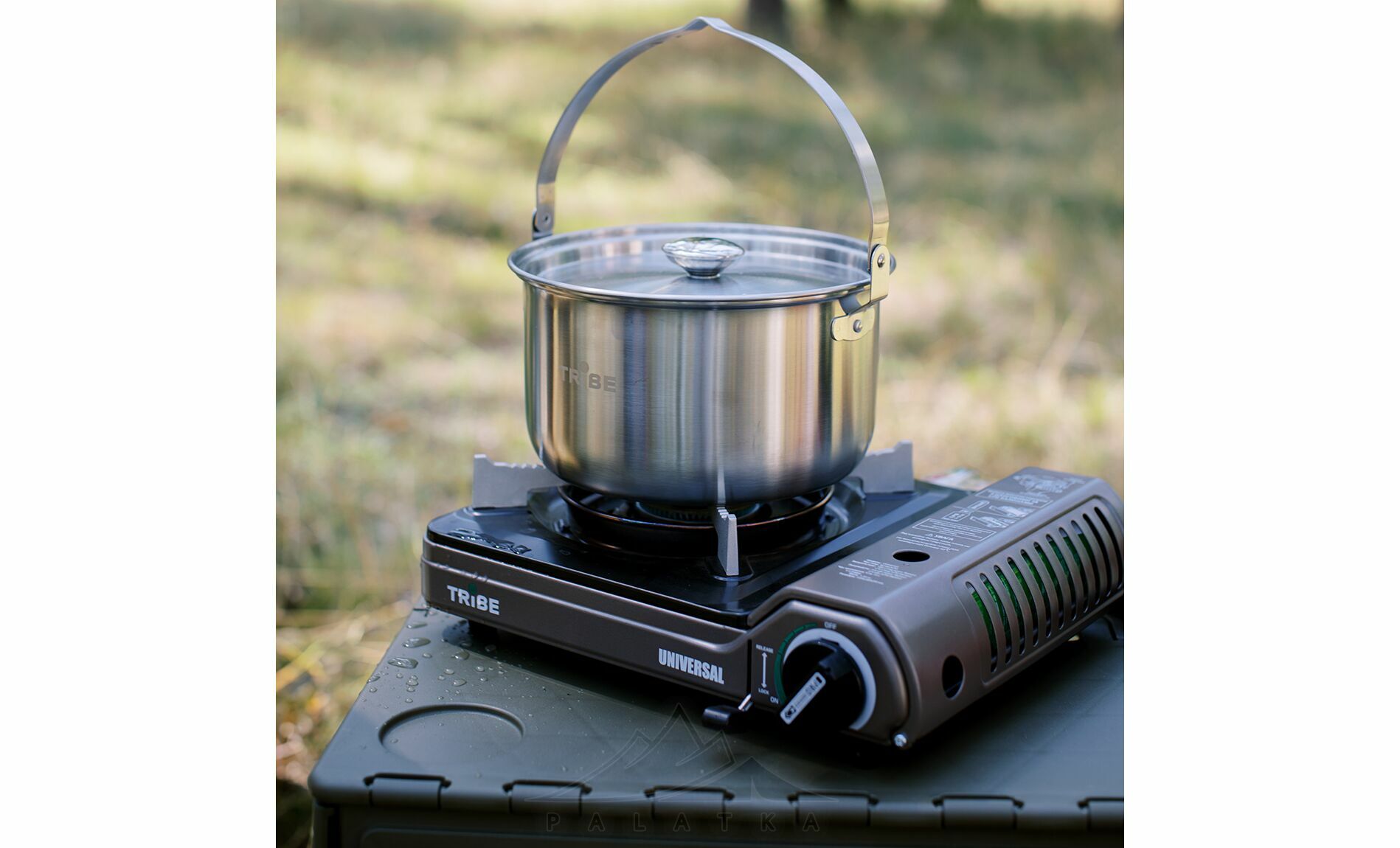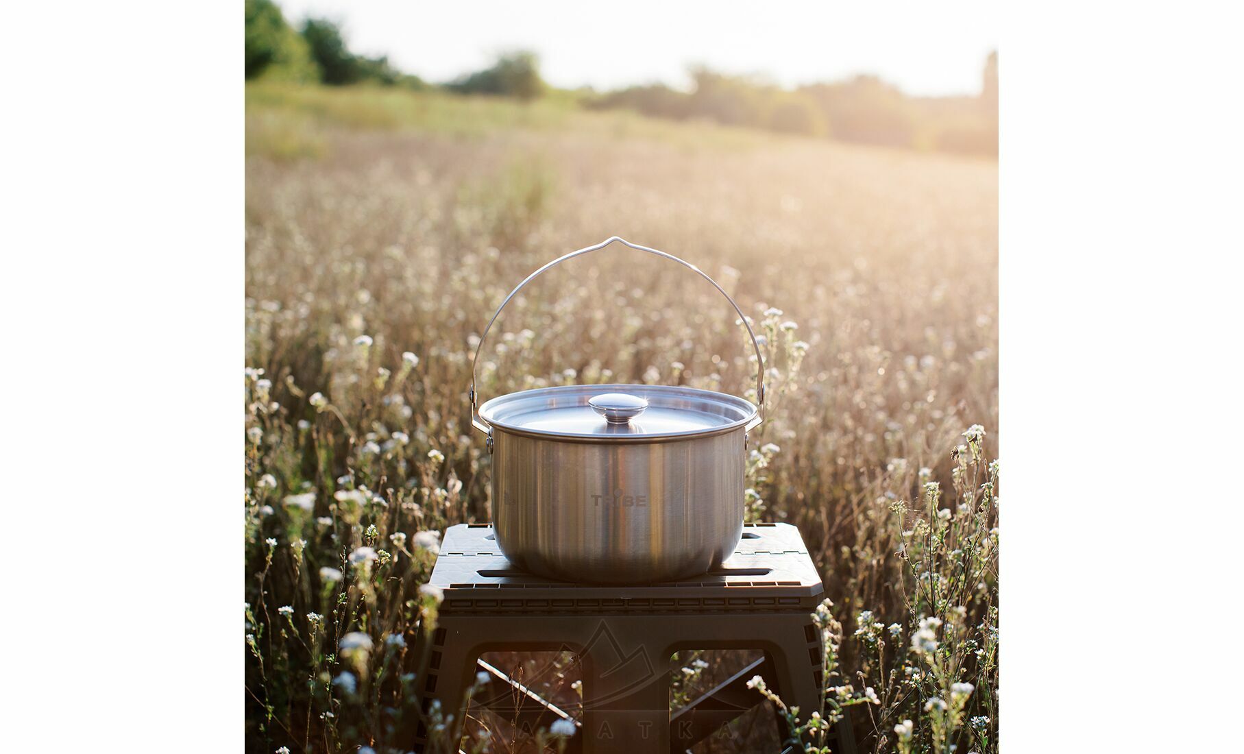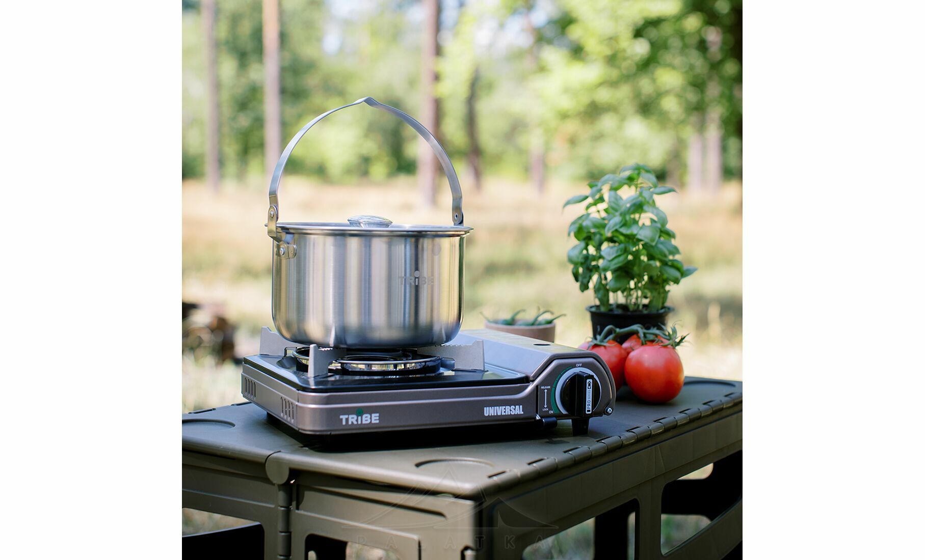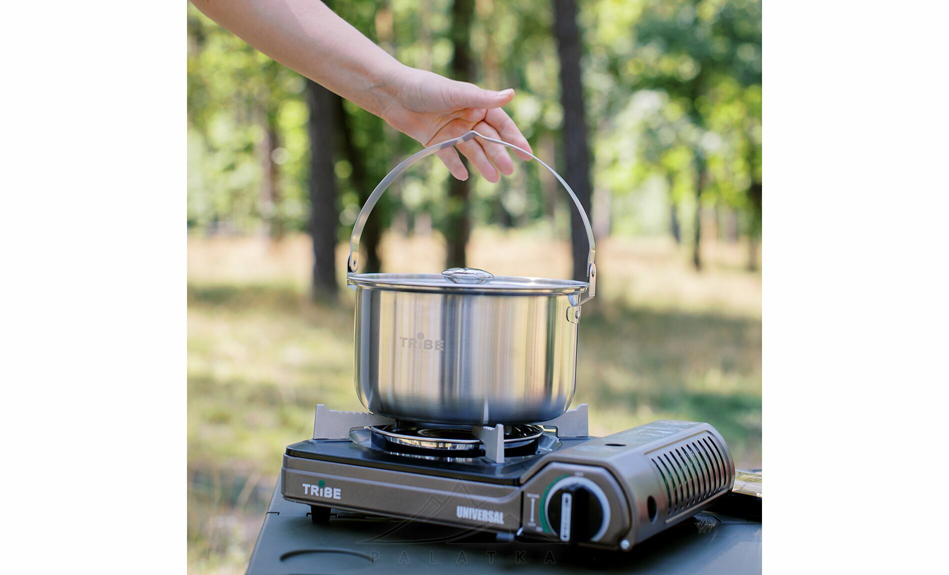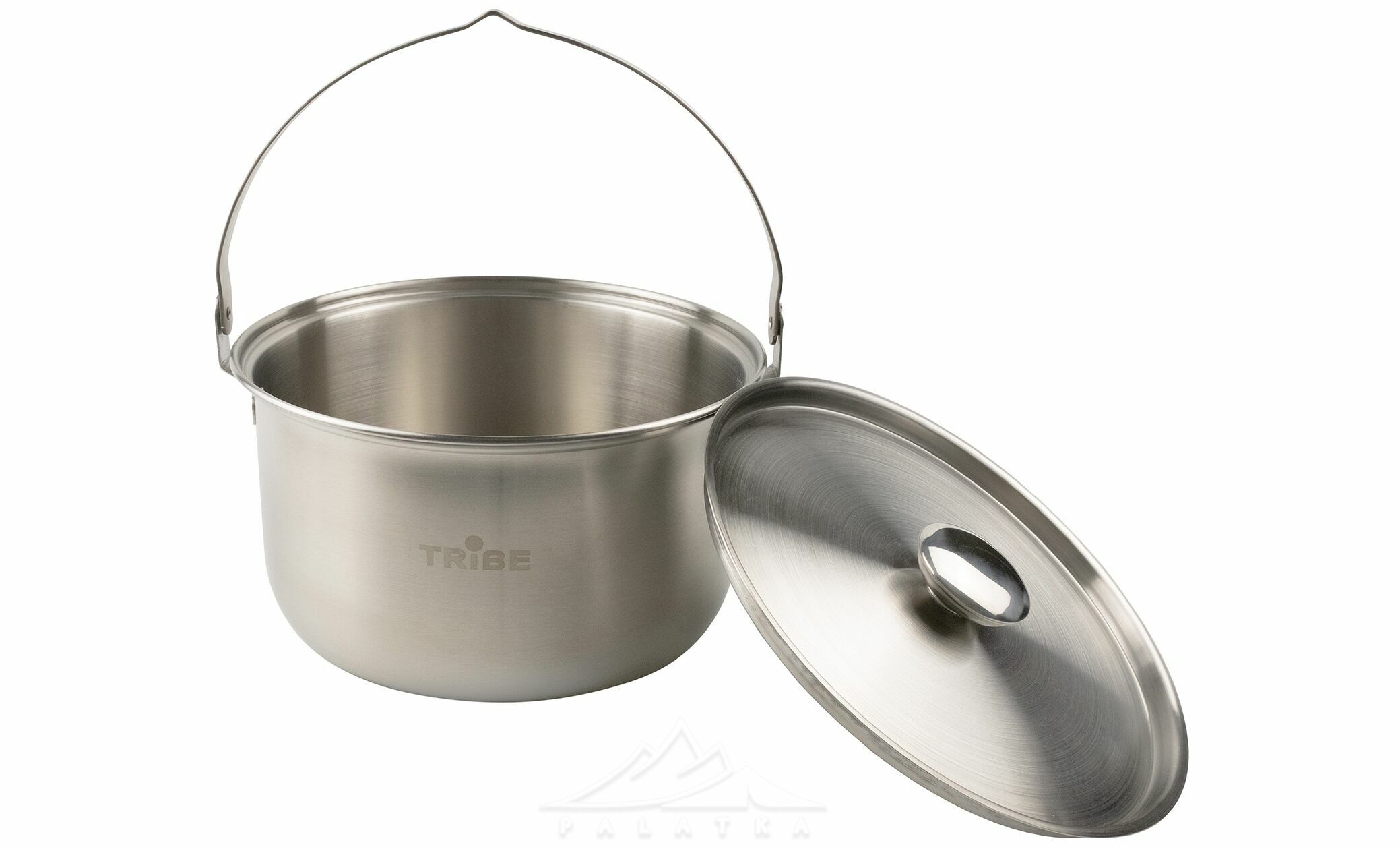 Tribe T-FH-0005 Family Pot — це універсальний казанок з харчової нержавіючої сталі, створений для приготування їжі на природі: у походах, кемпінгу чи на пікніку. Підходить для використання на відкритому вогні, пальнику або плиті, а зручна ручка дозволяє підвісити його над вогнищем.