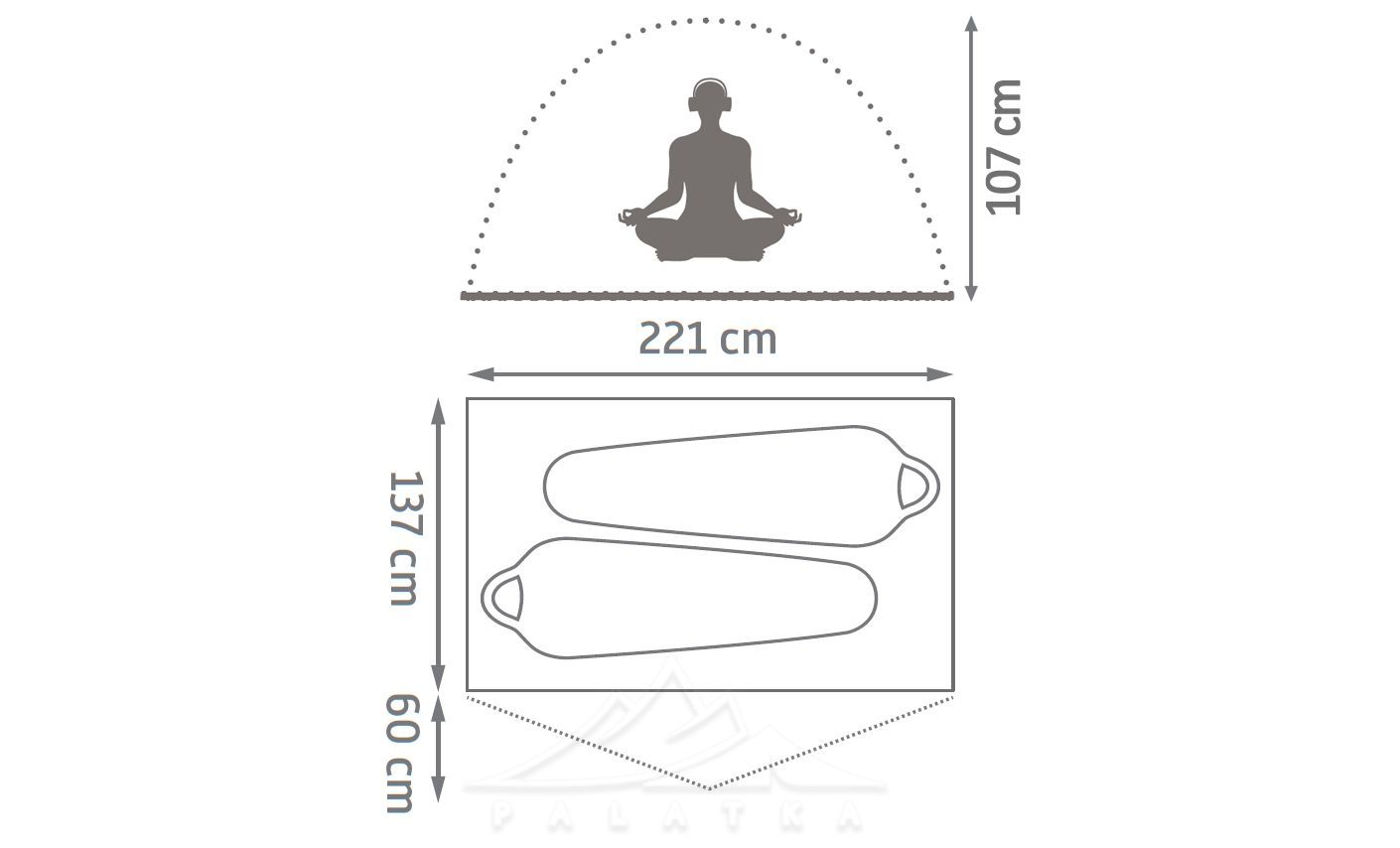 - Формат і місткість: 2-місний, 3-сезонний намет двошарової конструкції з 1 входом та тамбуром - оптимально для двох осіб або для одного з великим запасом простору під речі.
