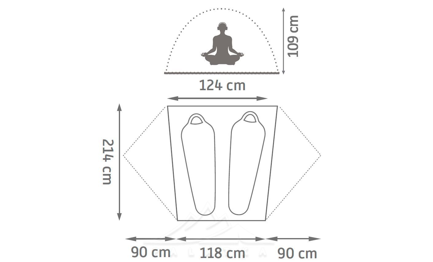 - Конструкція: 3-сезонний, двошаровий купольний намет на алюмінієвих дугах хабової конструкції. Також має додаткову напівдугу, що розширює корисний простір спальні та тамбурів.