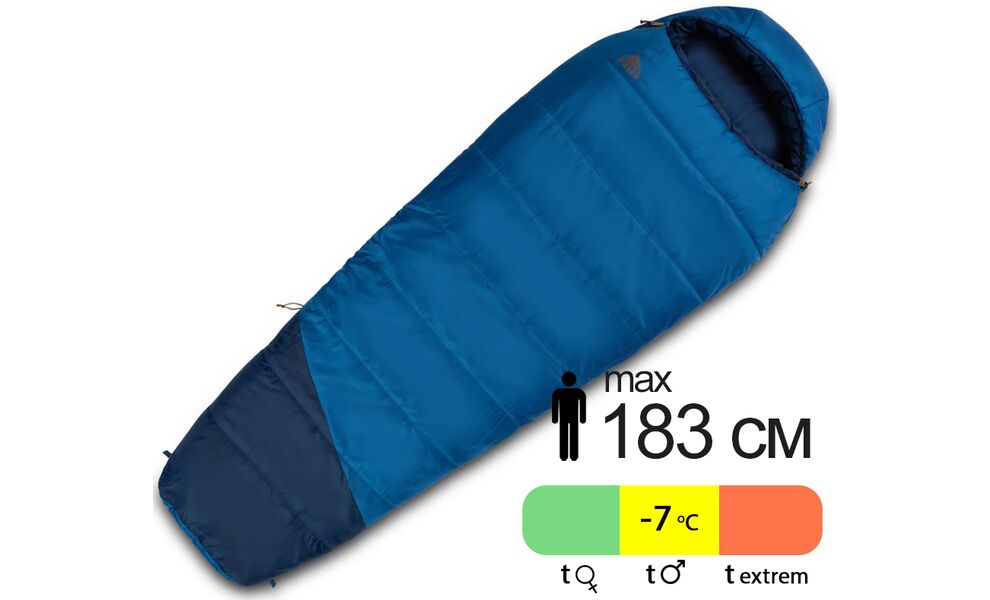 - Зміщена конструкція простьобування допомагає зменшити холодні зони, тому тепло розподіляється рівномірніше по всій площі спальника.