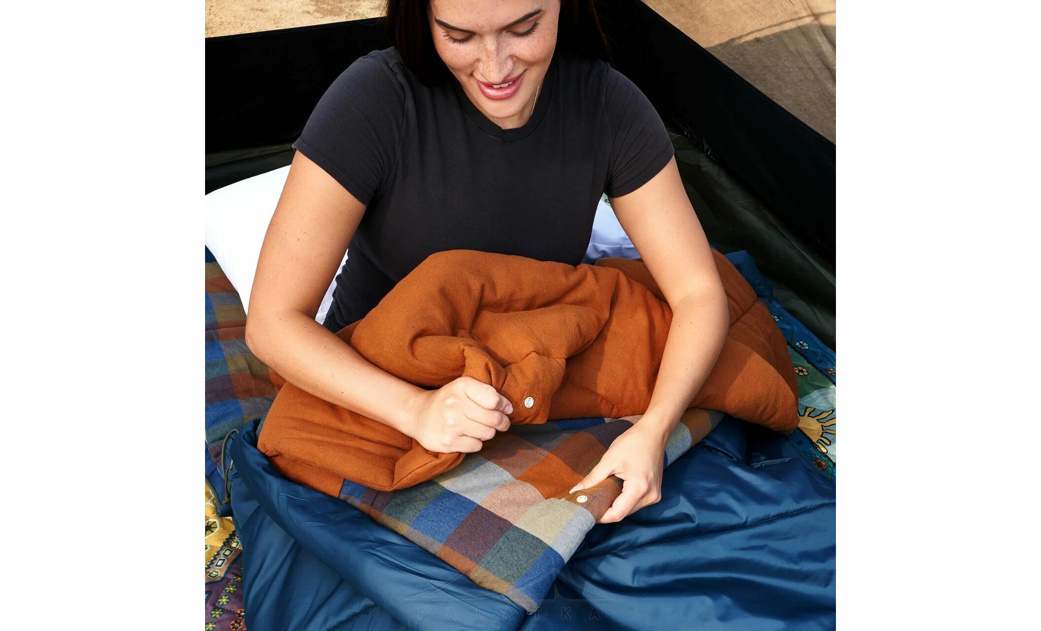 - Низькопрофільні кнопки допомагають фіксувати внутрішню ковдру так, як вам зручніше, тому спальник легше підлаштовується під звички сну і температуру.