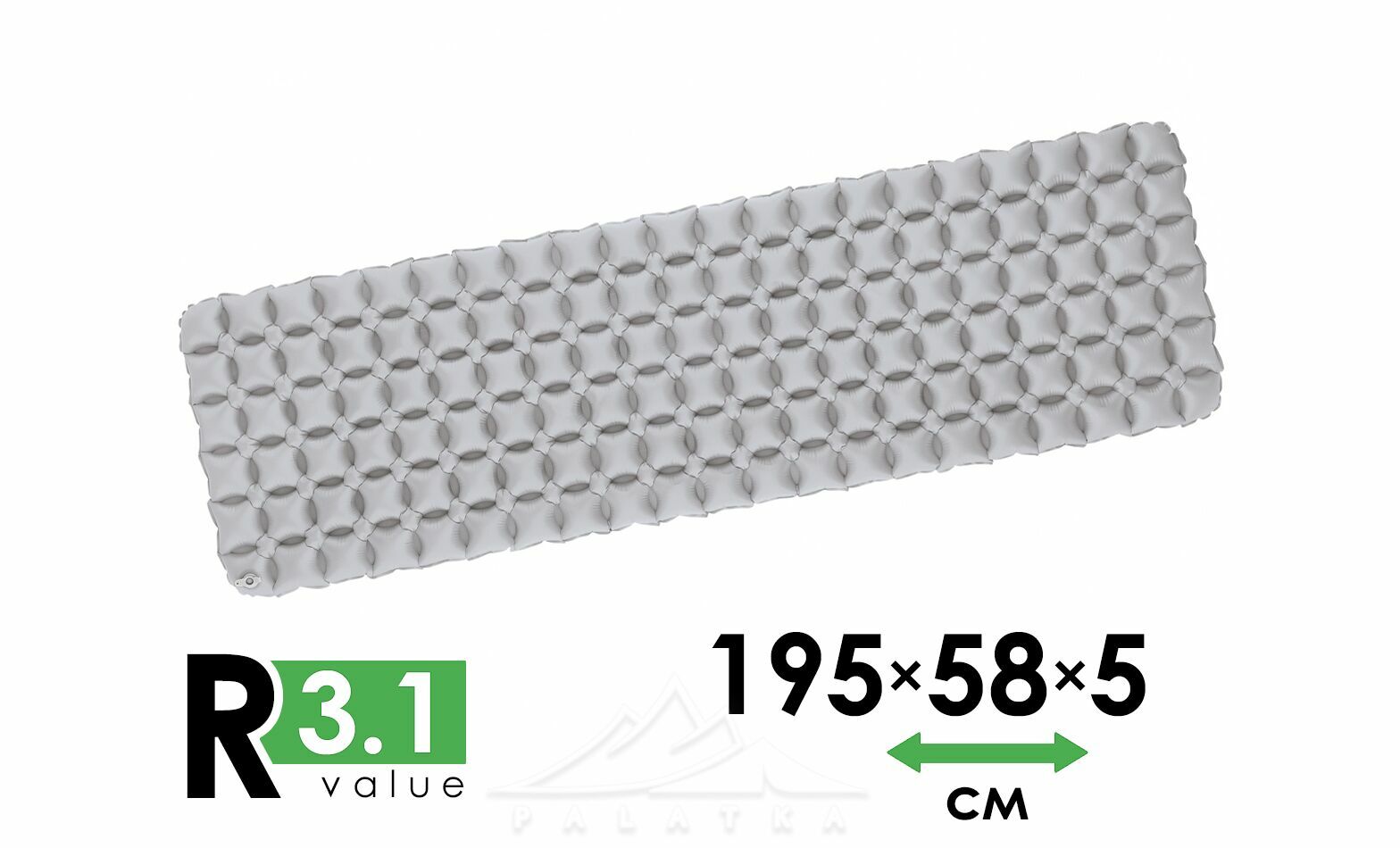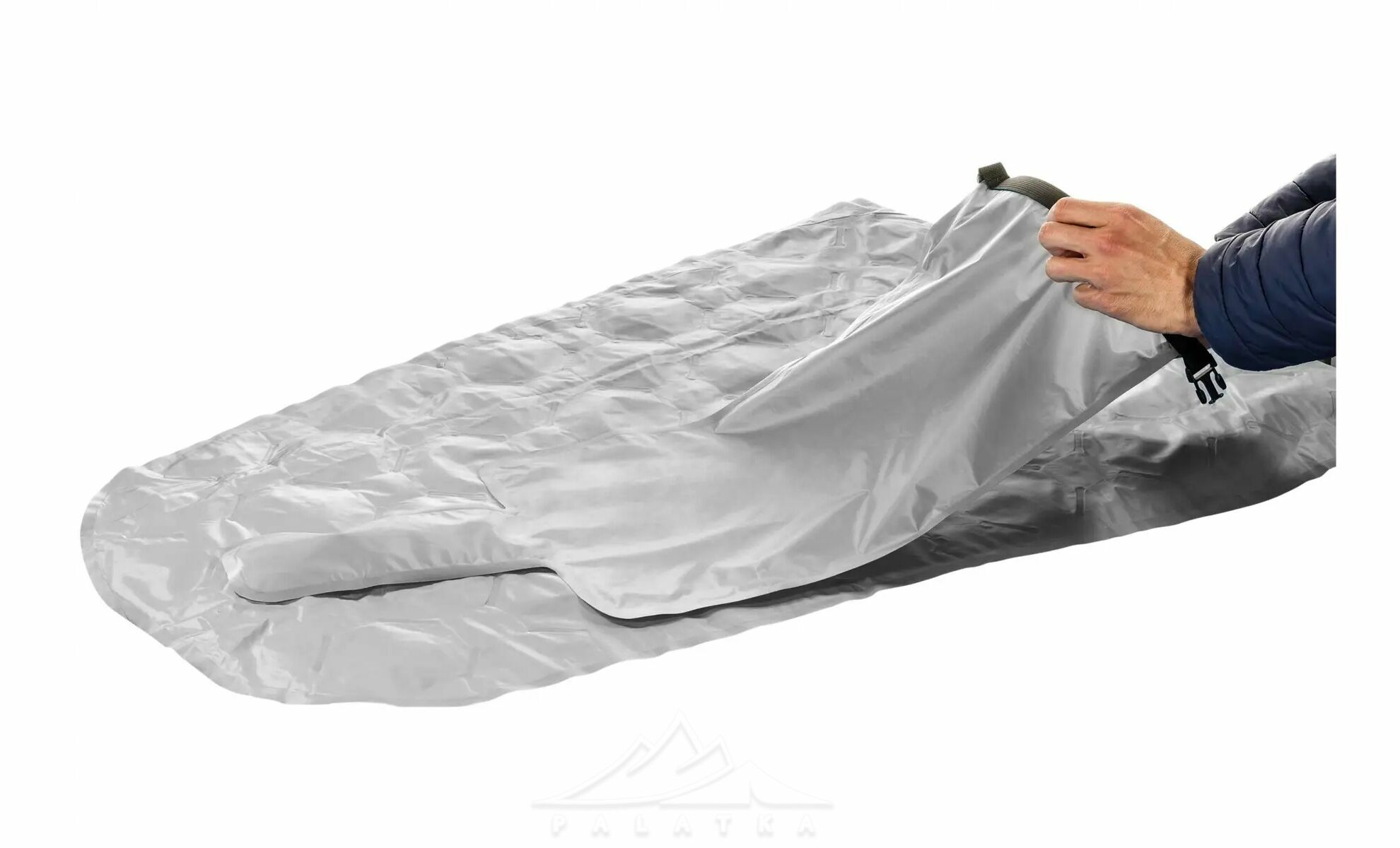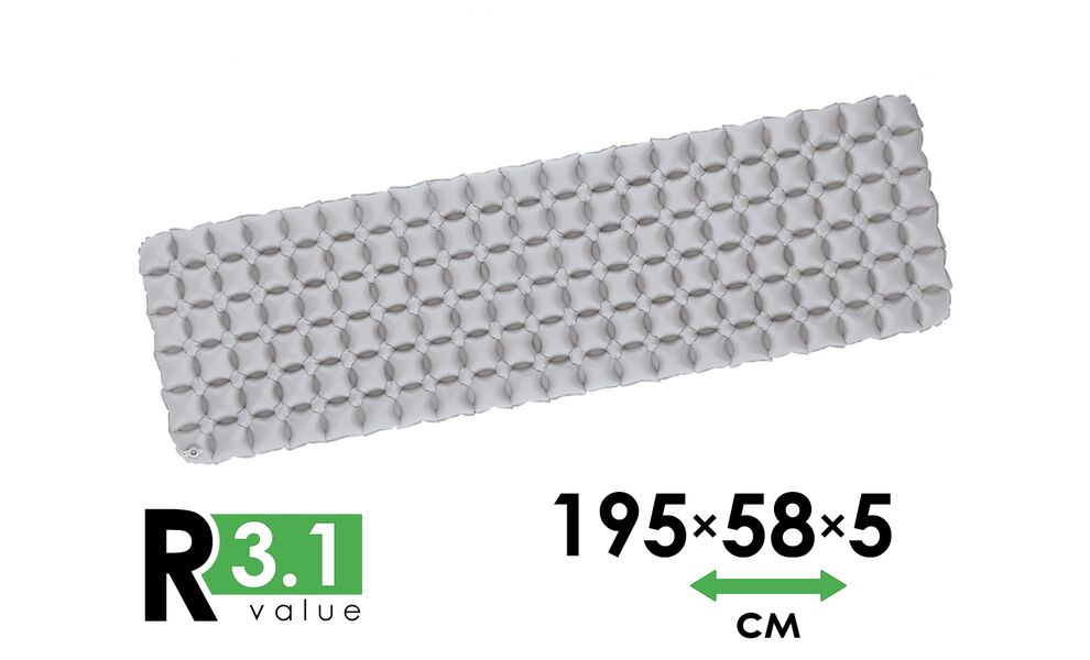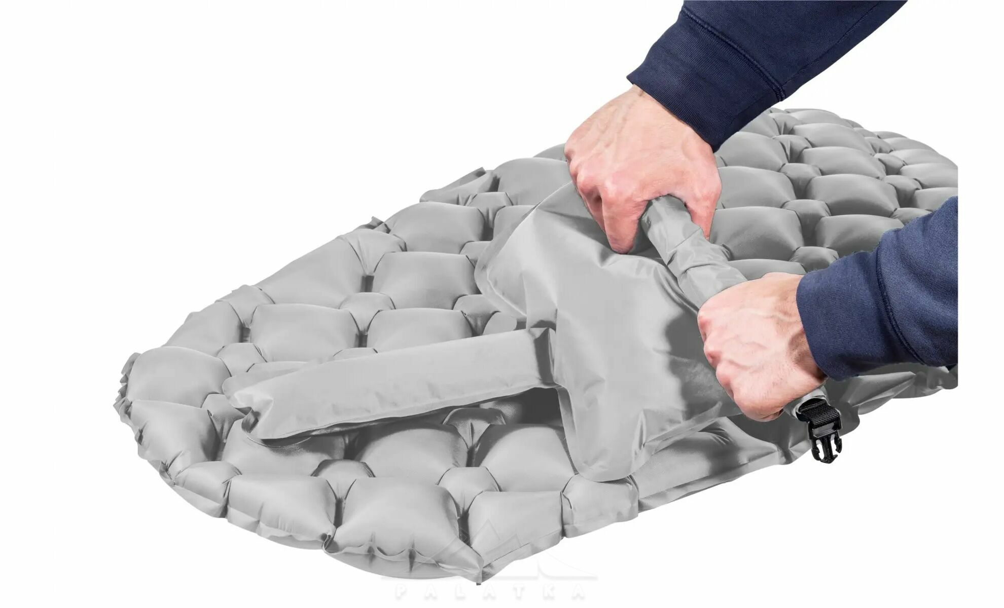 Цей килимок має вбудований клапан підкачування. Мішок для надування йде в комплекті (його можна використовувати в якості чохла для зберігання). Цей міцний килимок невеликого об’єму, виготовлений із нейлону Ripstop. Спеціальна конструкція з алюмінізованою плівкою з внутрішньої сторони покращує термостійкість килимка, що робить його придатним для використання протягом трьох сезонів. Численні роздільні камери, заповнені повітрям, повторюють контури вашого тіла, забезпечуючи максимально комфортний сон.