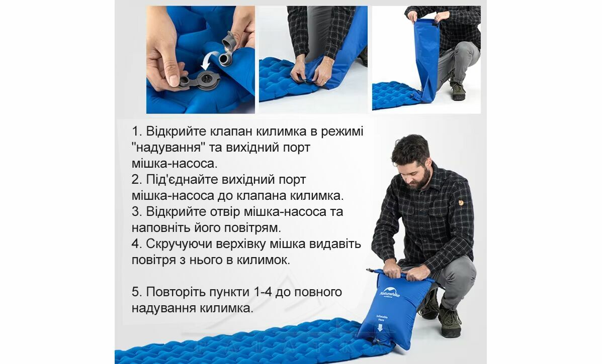 - Сумісний з мішком-насосом Naturehike NH19Q033-D для надування килимка (не комплектується, продається окремо)