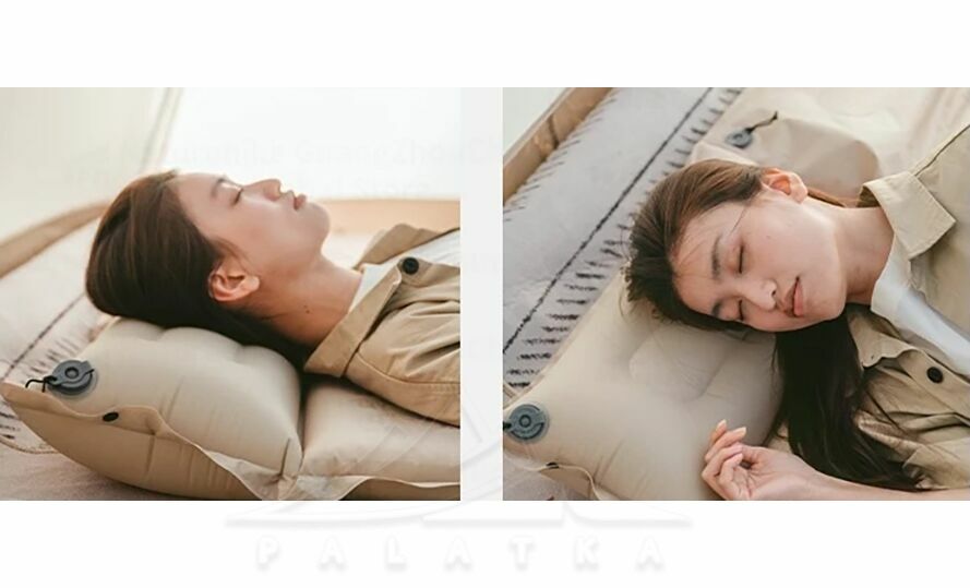 - Вбудована подушка для максимального комфорту під час сну та відпочинку. Вона надувається через окремий клапан, що дозволяє легко регулювати висоту, а ергономічна форма з рельєфною поверхнею підтримує природне положення голови і знижує навантаження на шийний відділ.
